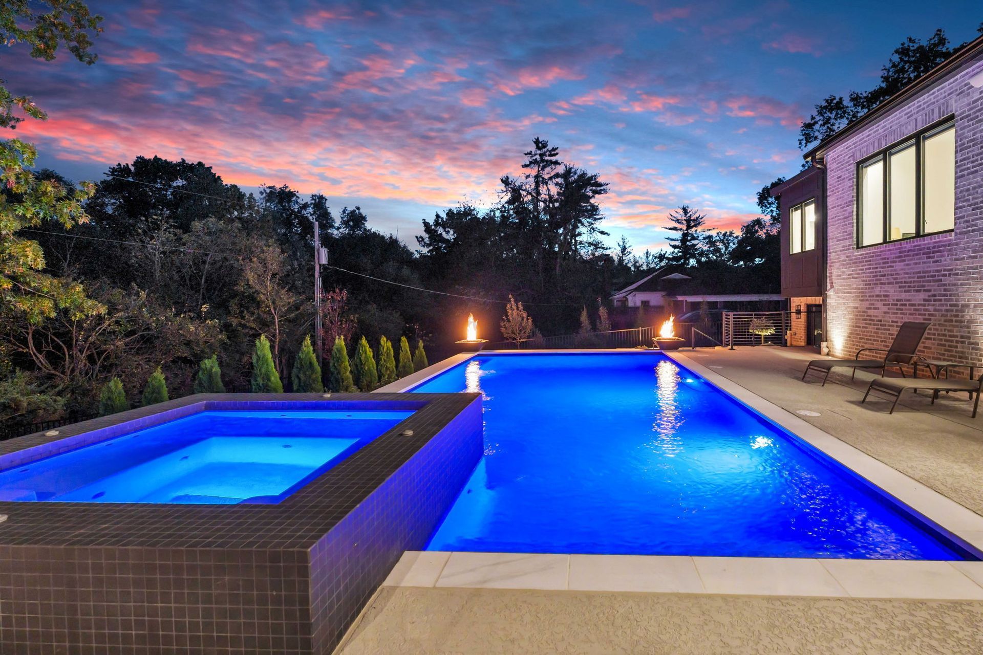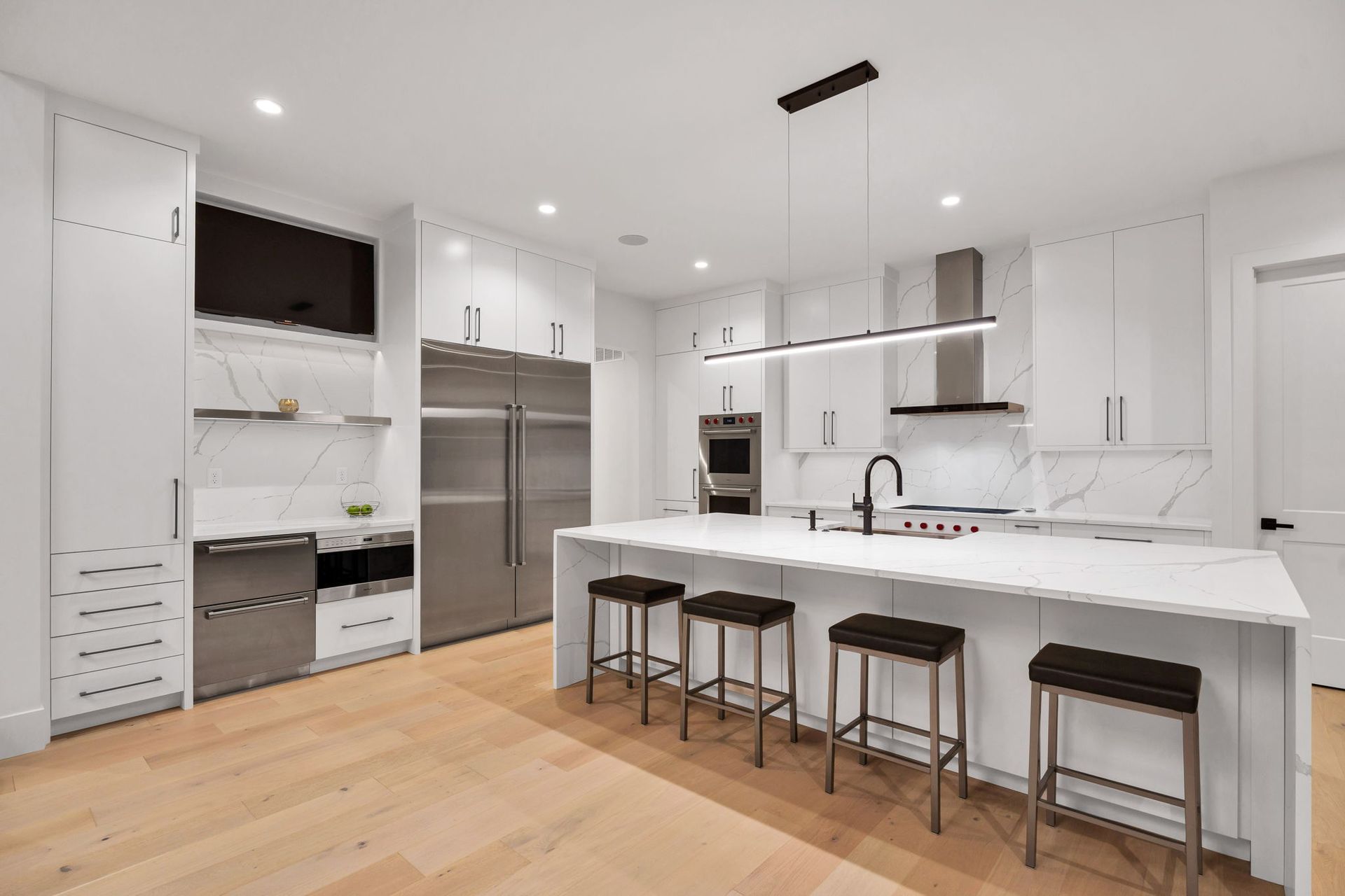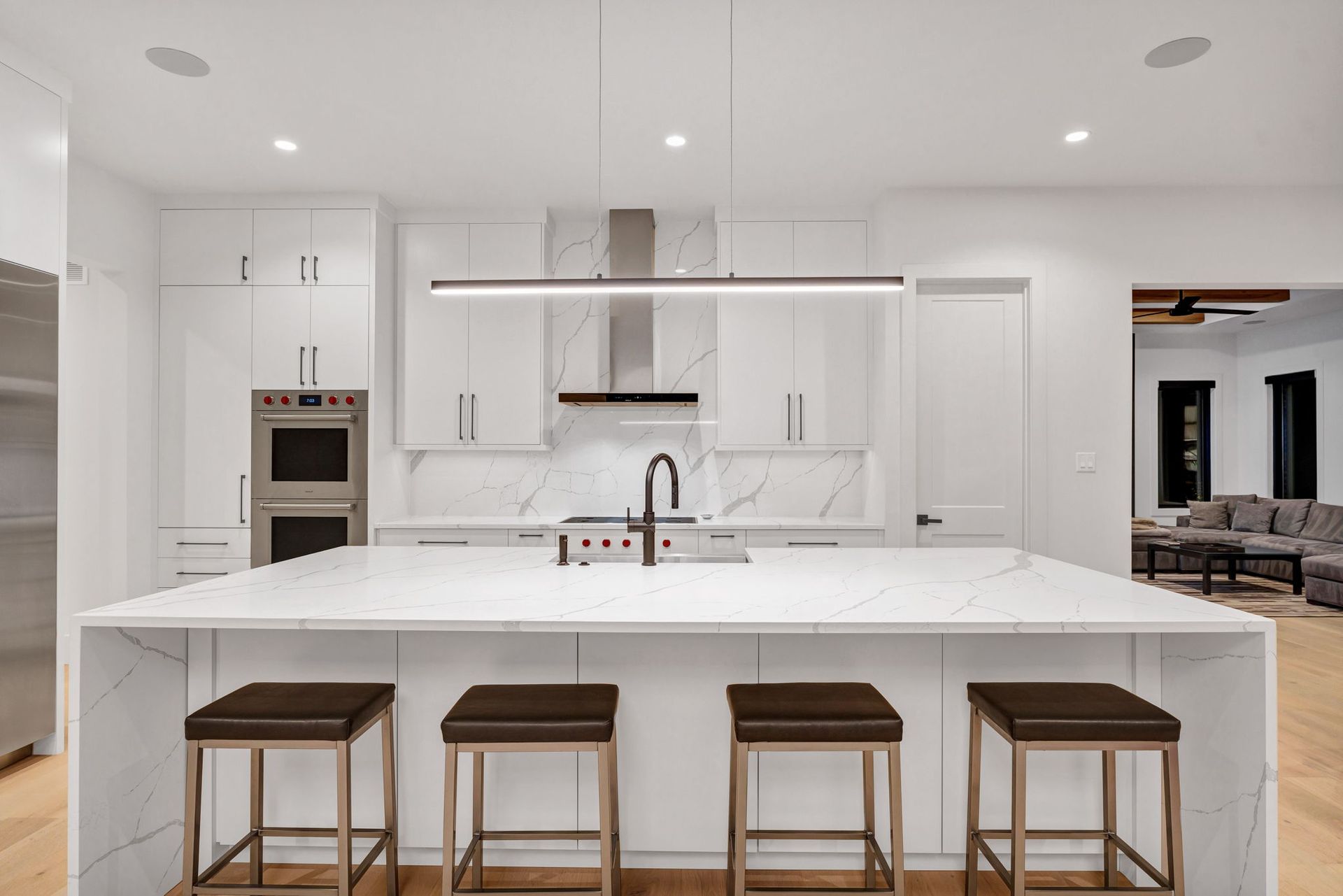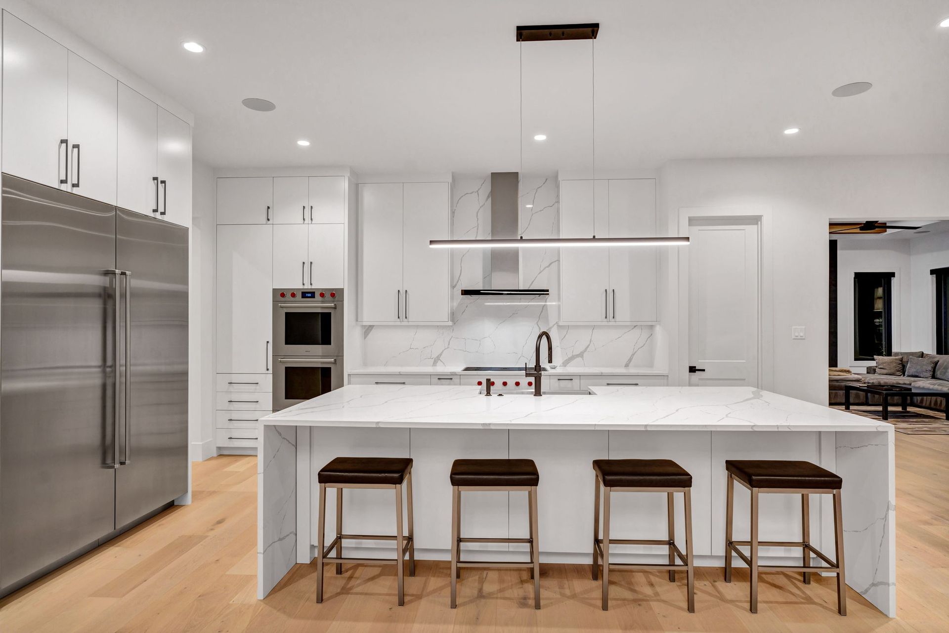 The main level is anchored by wide-plank hardwood floors, 10-foot ceilings, and crisp millwork throughout. The chef’s kitchen is both refined and functional, featuring a bold island, sleek cabinetry, statement lighting, and premium appliances—perfectly positioned to flow into the adjoining hearth room for effortless everyday living and entertaining. Large windows flood the space with natural light and frame views of the surrounding landscape, while the covered outdoor living area with fireplace extends the home’s livability beyond the interior.