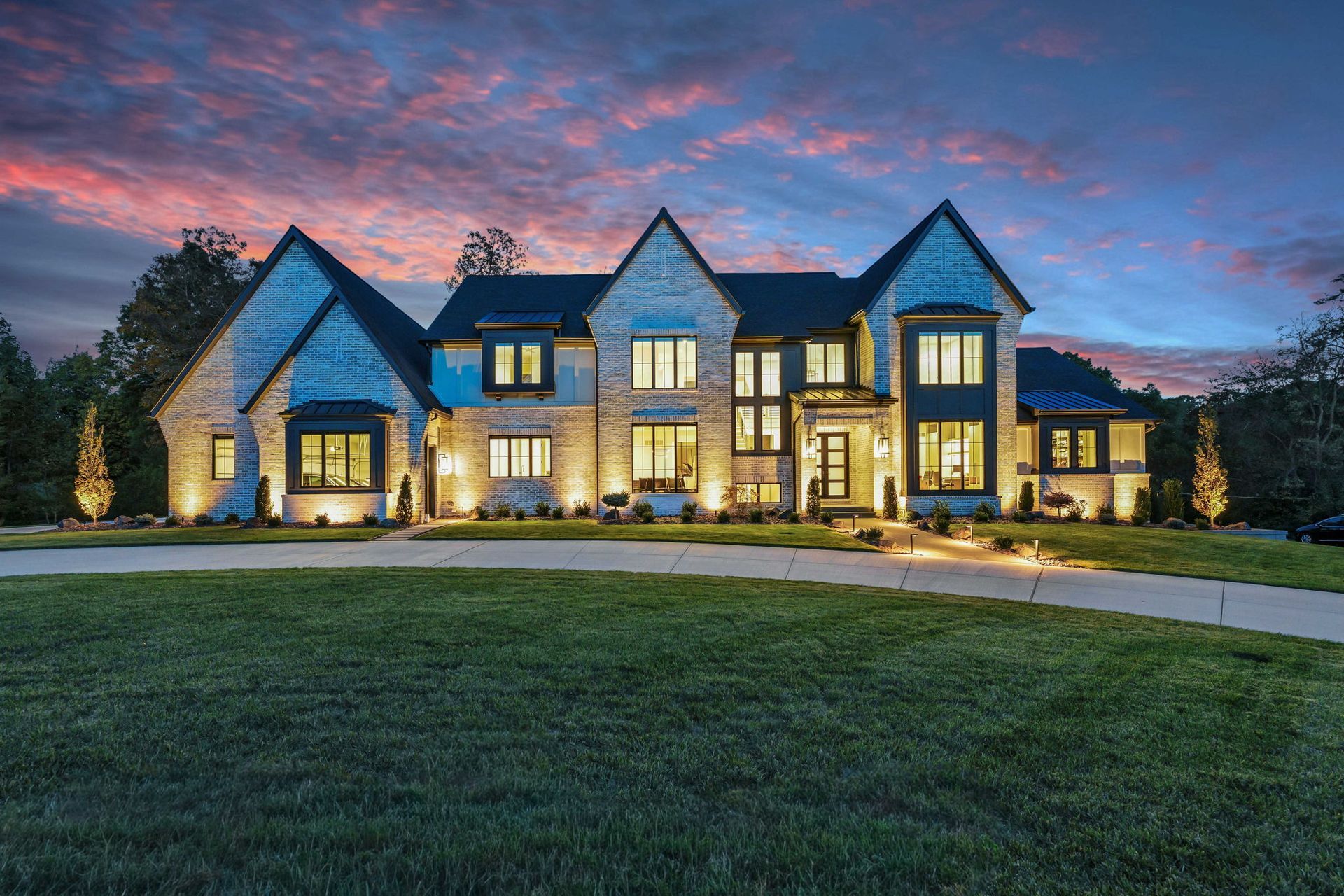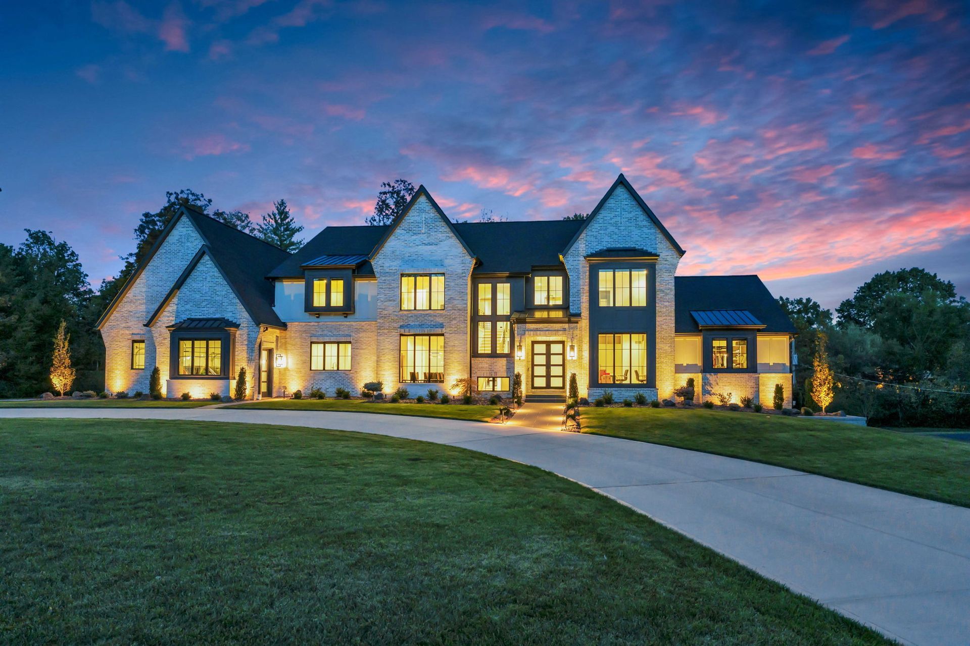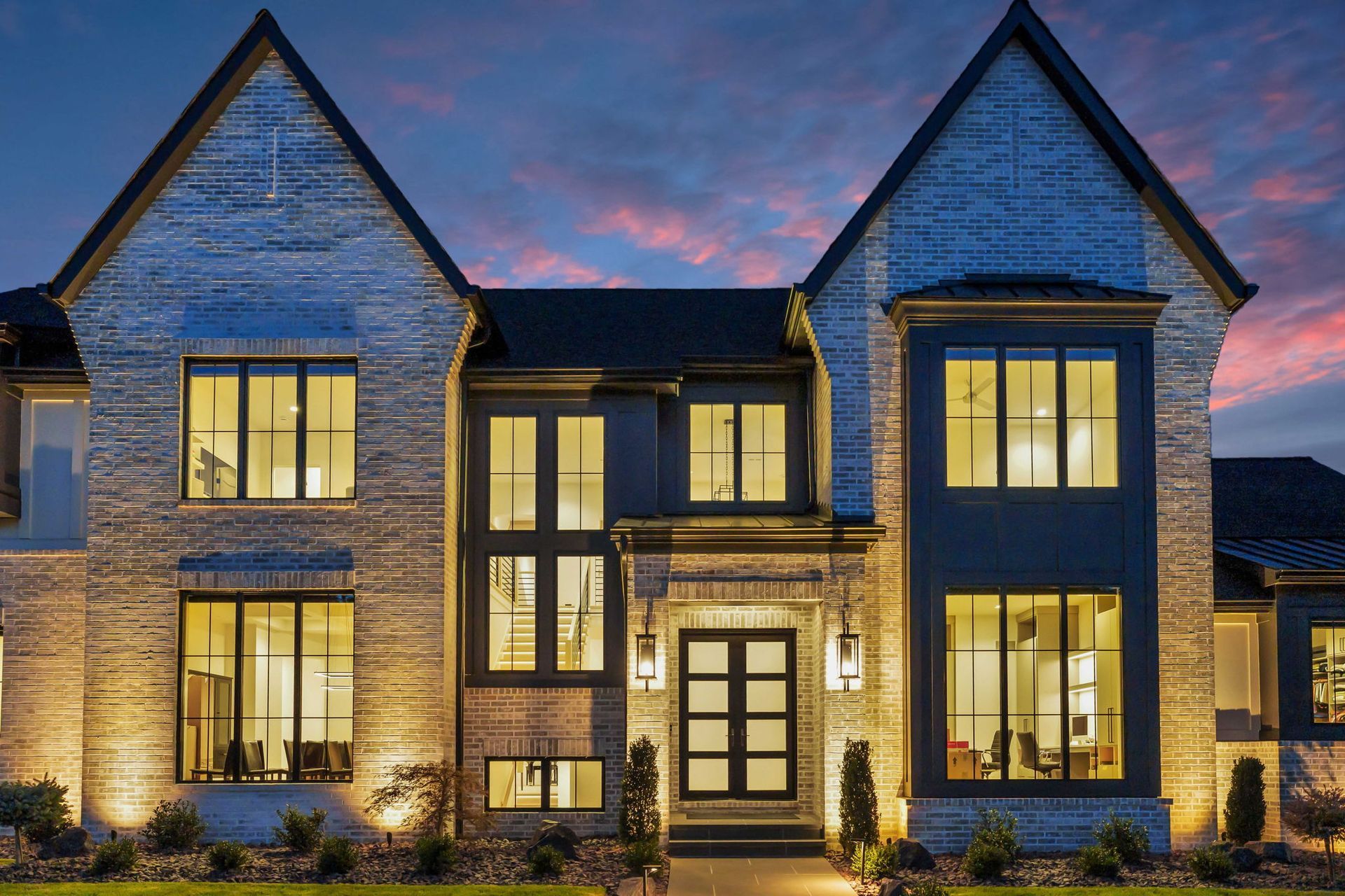 This transitional-style residence offers nearly 8,000 square feet of thoughtfully designed living space, blending clean architectural lines with warm, livable luxury. A dramatic two-story foyer immediately sets the tone, opening to a vaulted great room defined by exposed timber beams, expansive black-framed windows, and a striking floor-to-ceiling fireplace flanked by custom floating shelving.