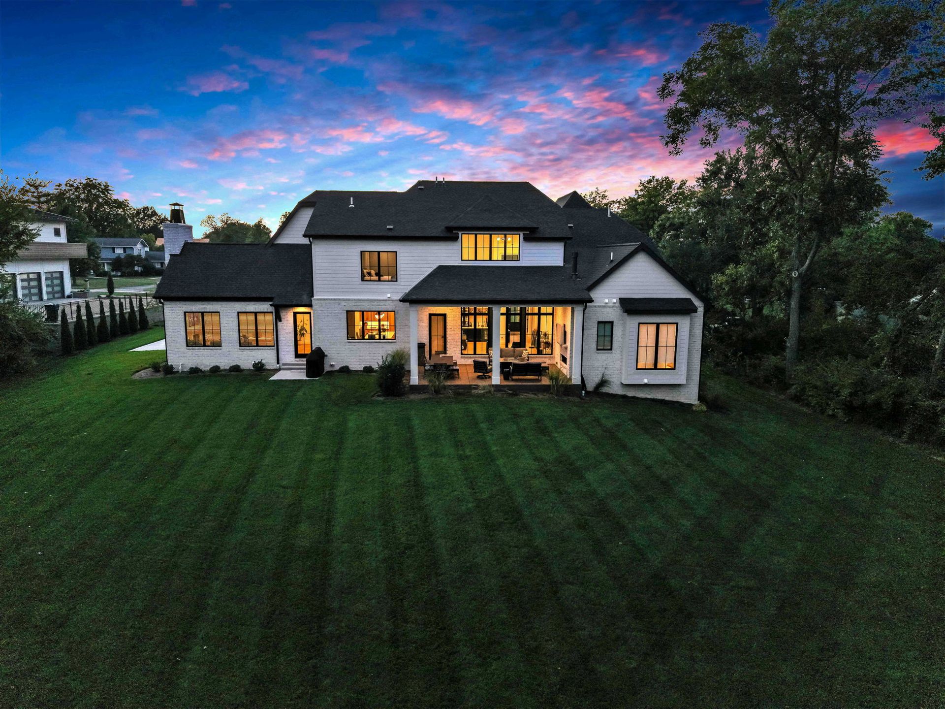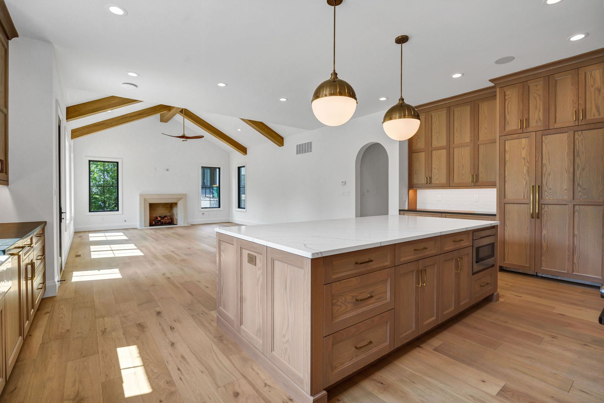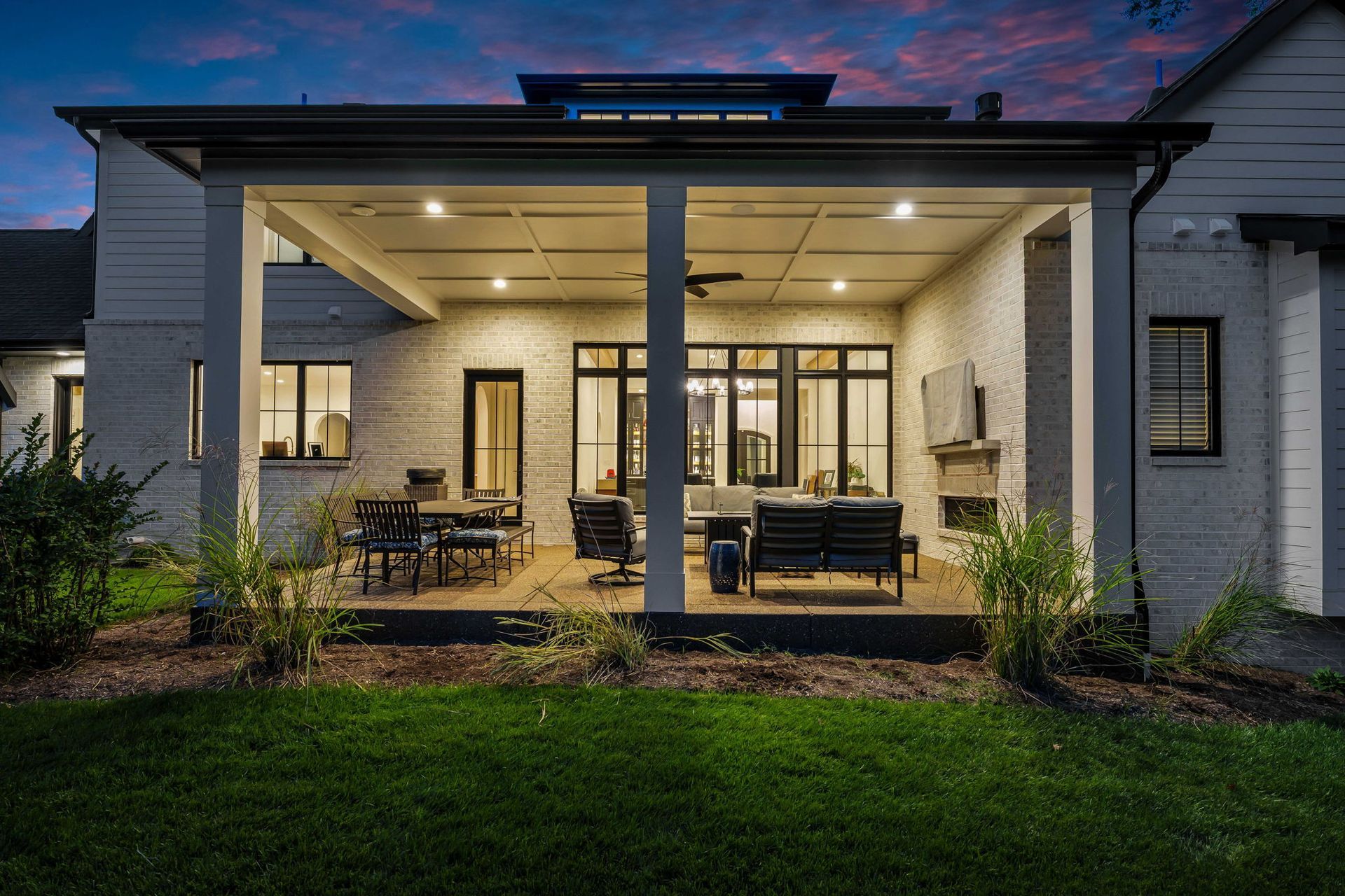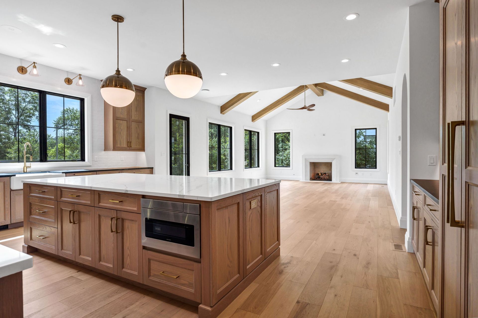 The main level pairs elegance with comfort, featuring 10-foot ceilings, wide-plank hardwood floors, and detailed millwork throughout. At its center, a chef-inspired kitchen with top-tier appliances opens to a warm hearth room, while a covered patio with fireplace extends living outdoors to the expansive backyard.