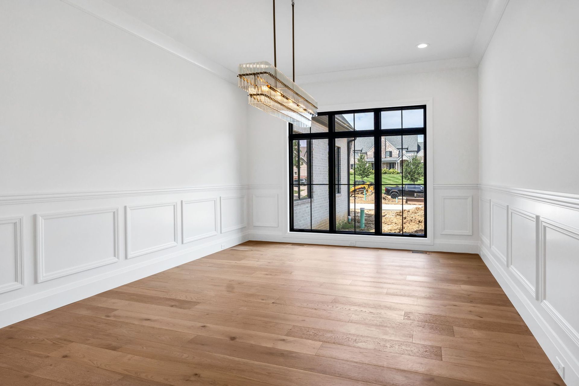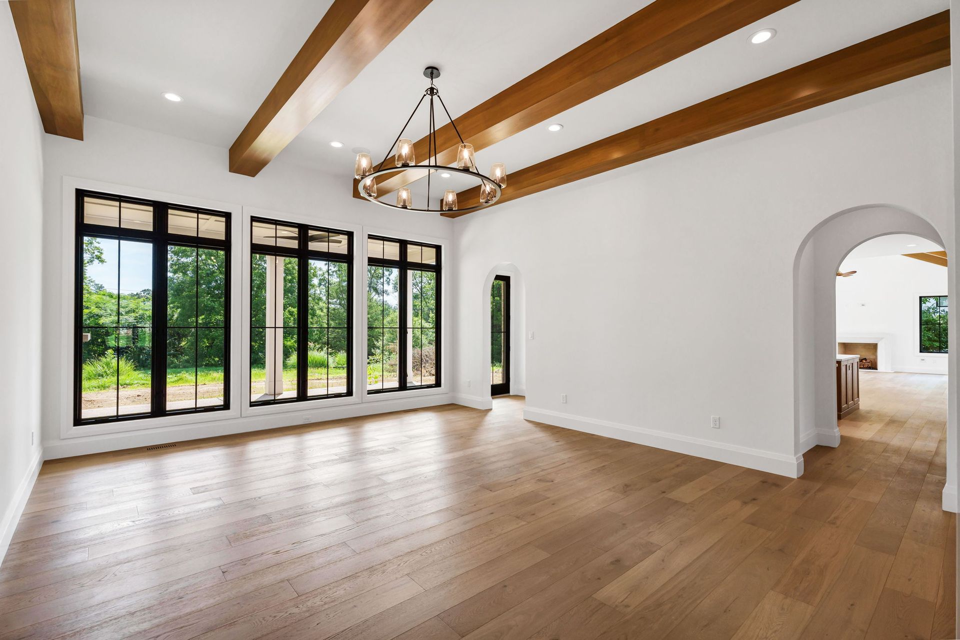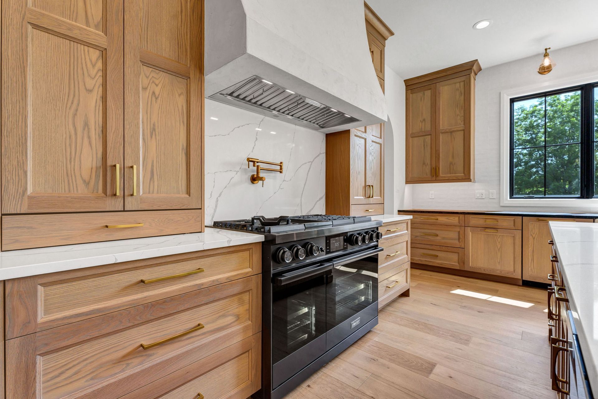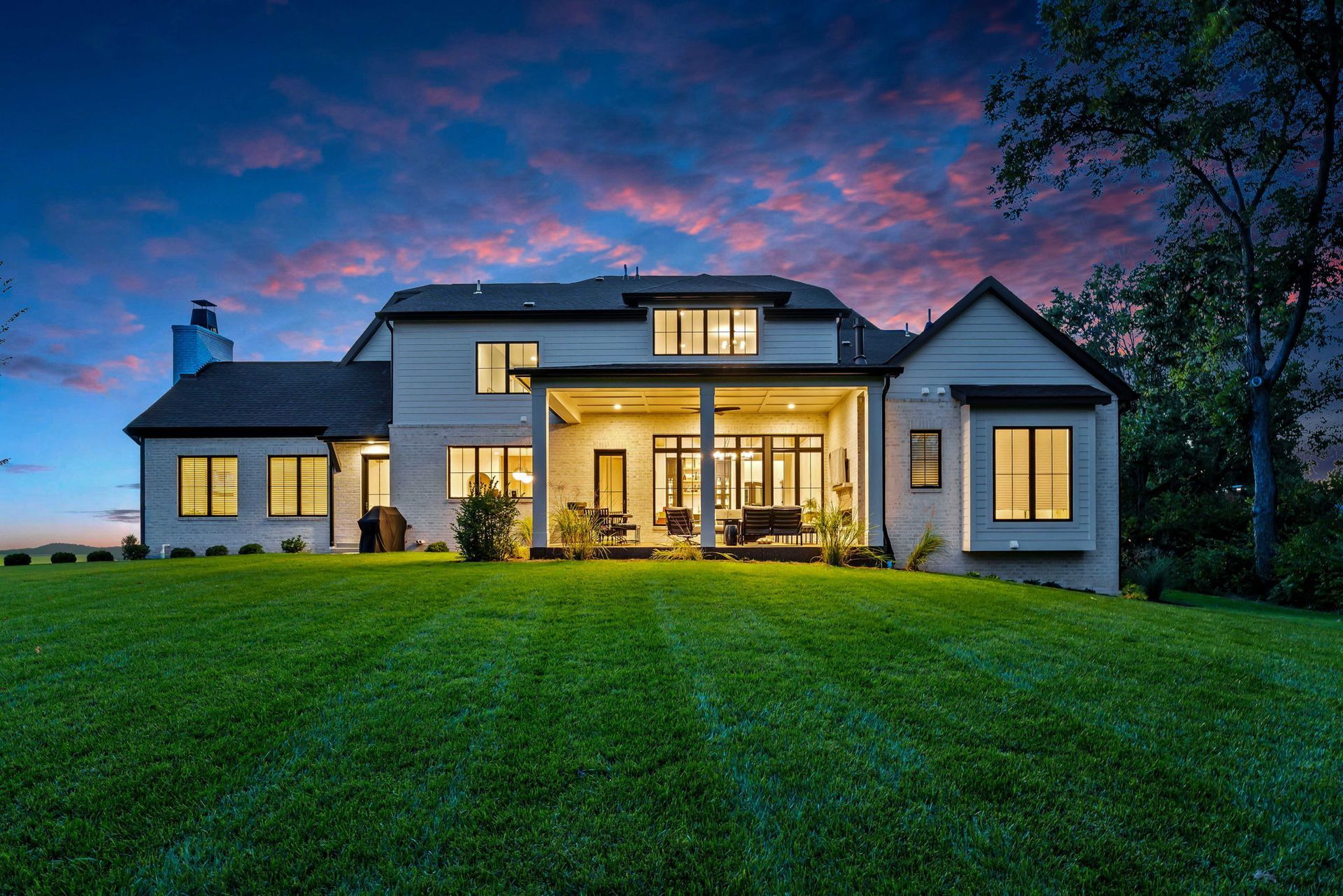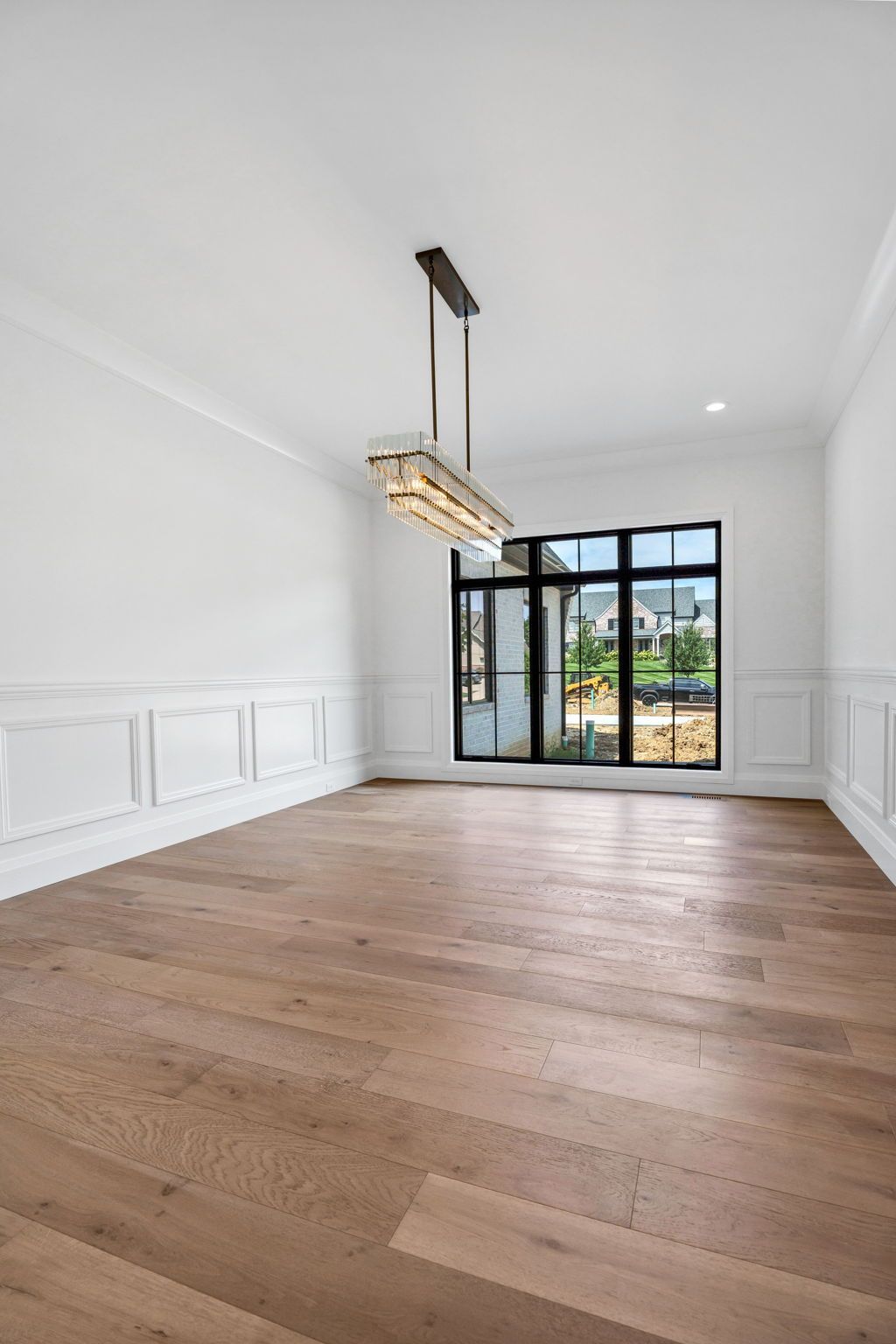 The main level pairs elegance with comfort, featuring 10-foot ceilings, wide-plank hardwood floors, and detailed millwork throughout. At its center, a chef-inspired kitchen with top-tier appliances opens to a warm hearth room, while a covered patio with fireplace extends living outdoors to the expansive backyard.