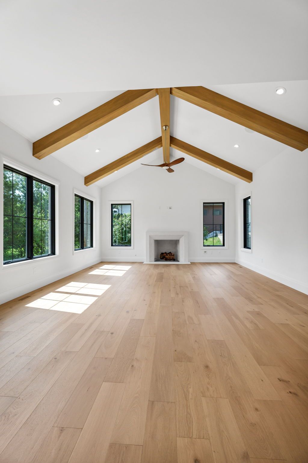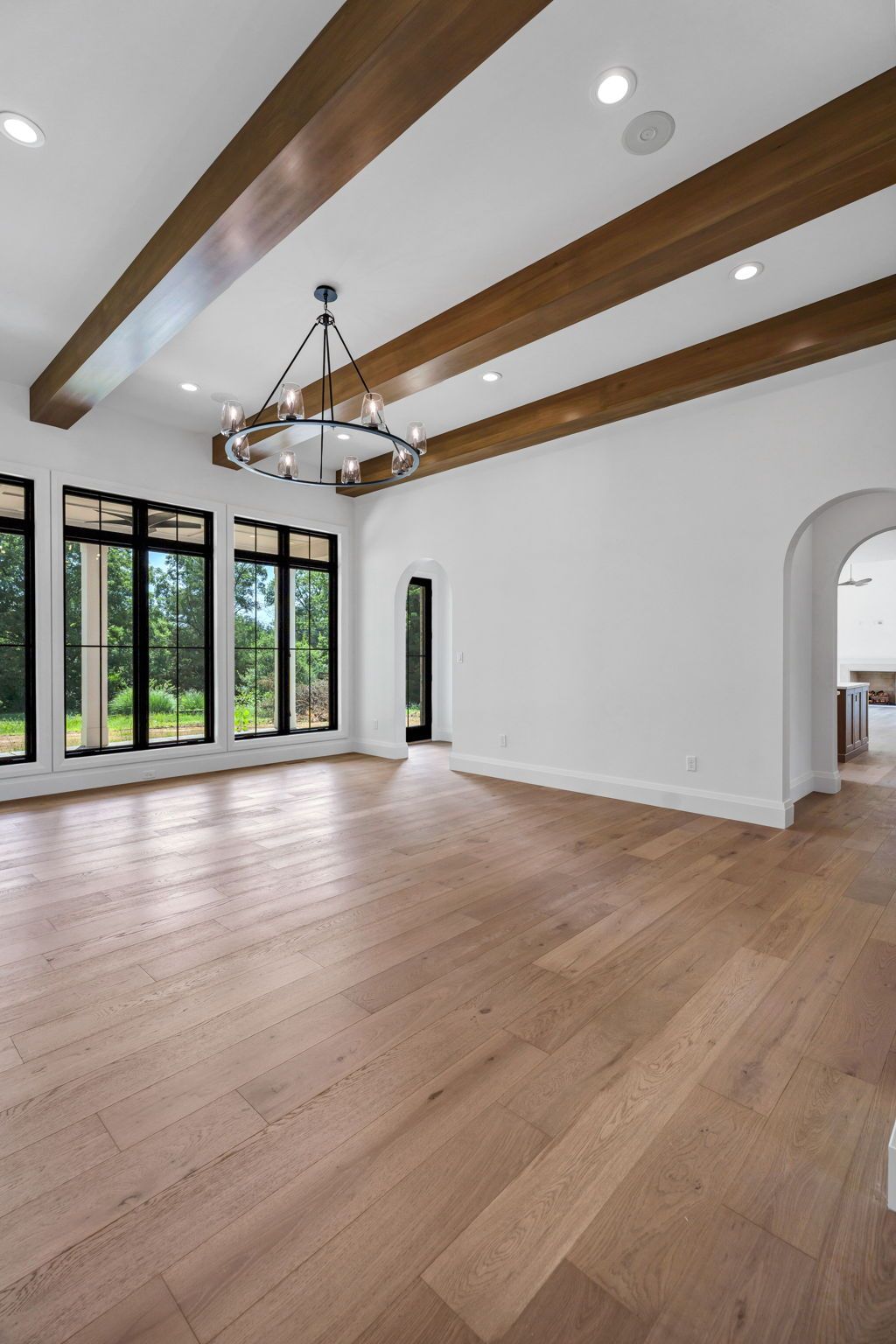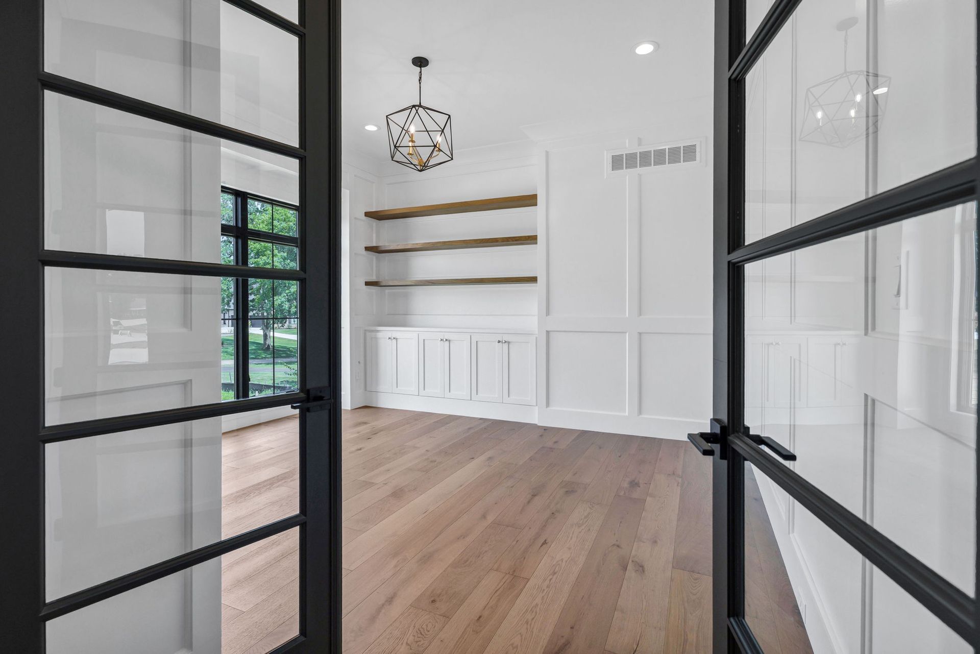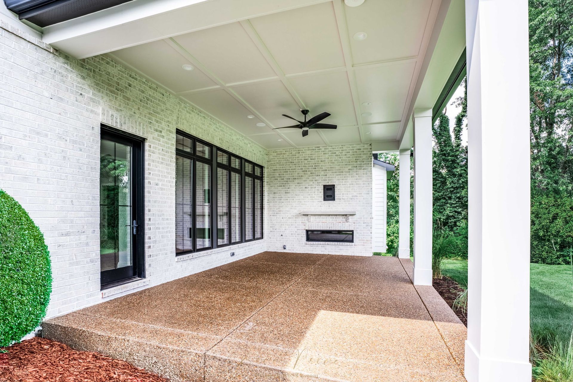 The main level pairs elegance with comfort, featuring 10-foot ceilings, wide-plank hardwood floors, and detailed millwork throughout. At its center, a chef-inspired kitchen with top-tier appliances opens to a warm hearth room, while a covered patio with fireplace extends living outdoors to the expansive backyard.