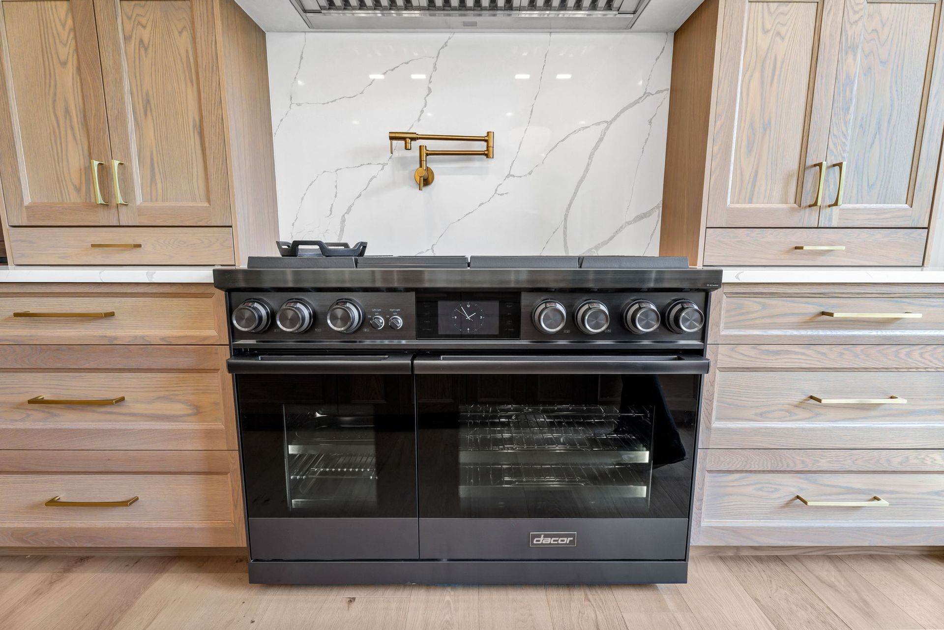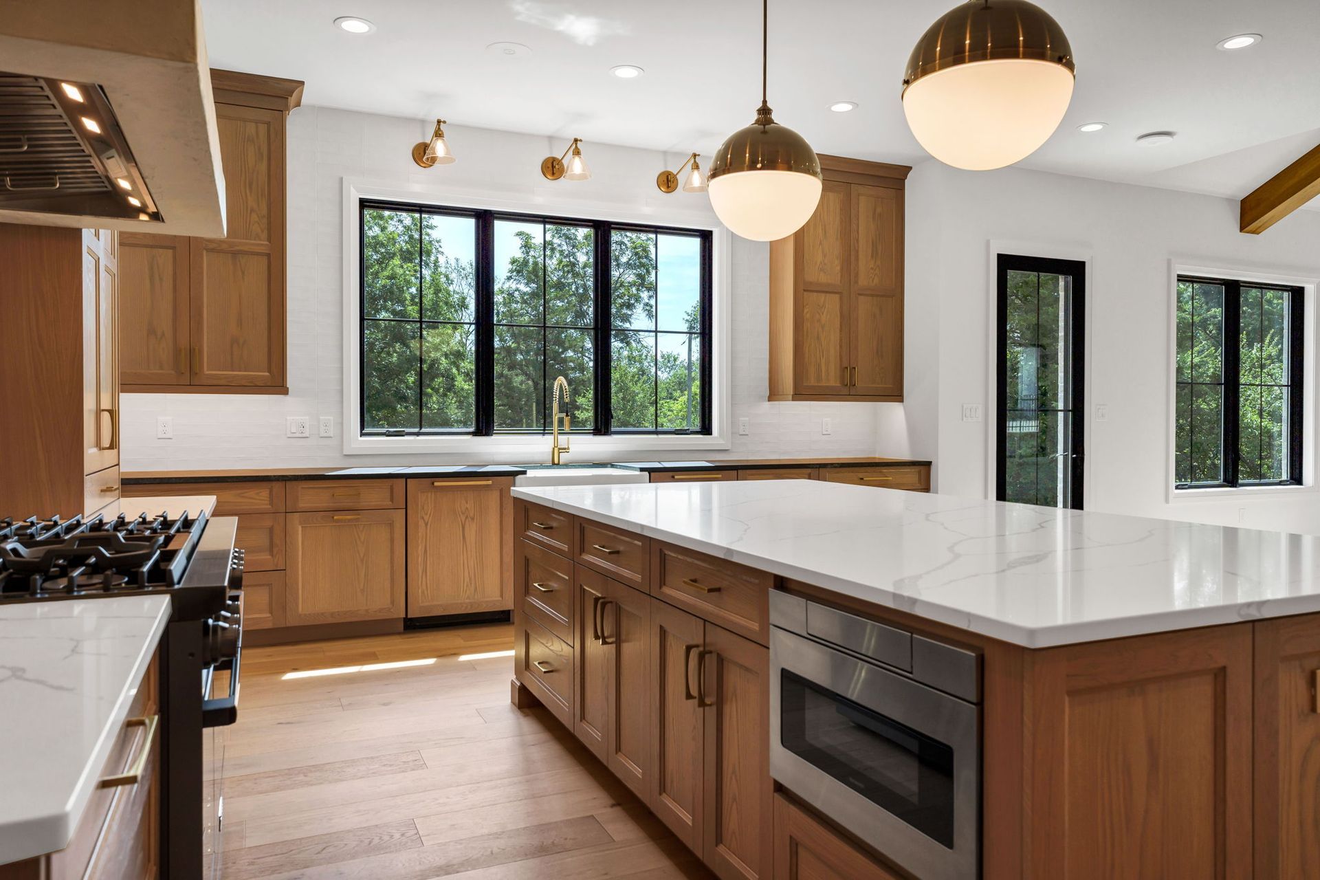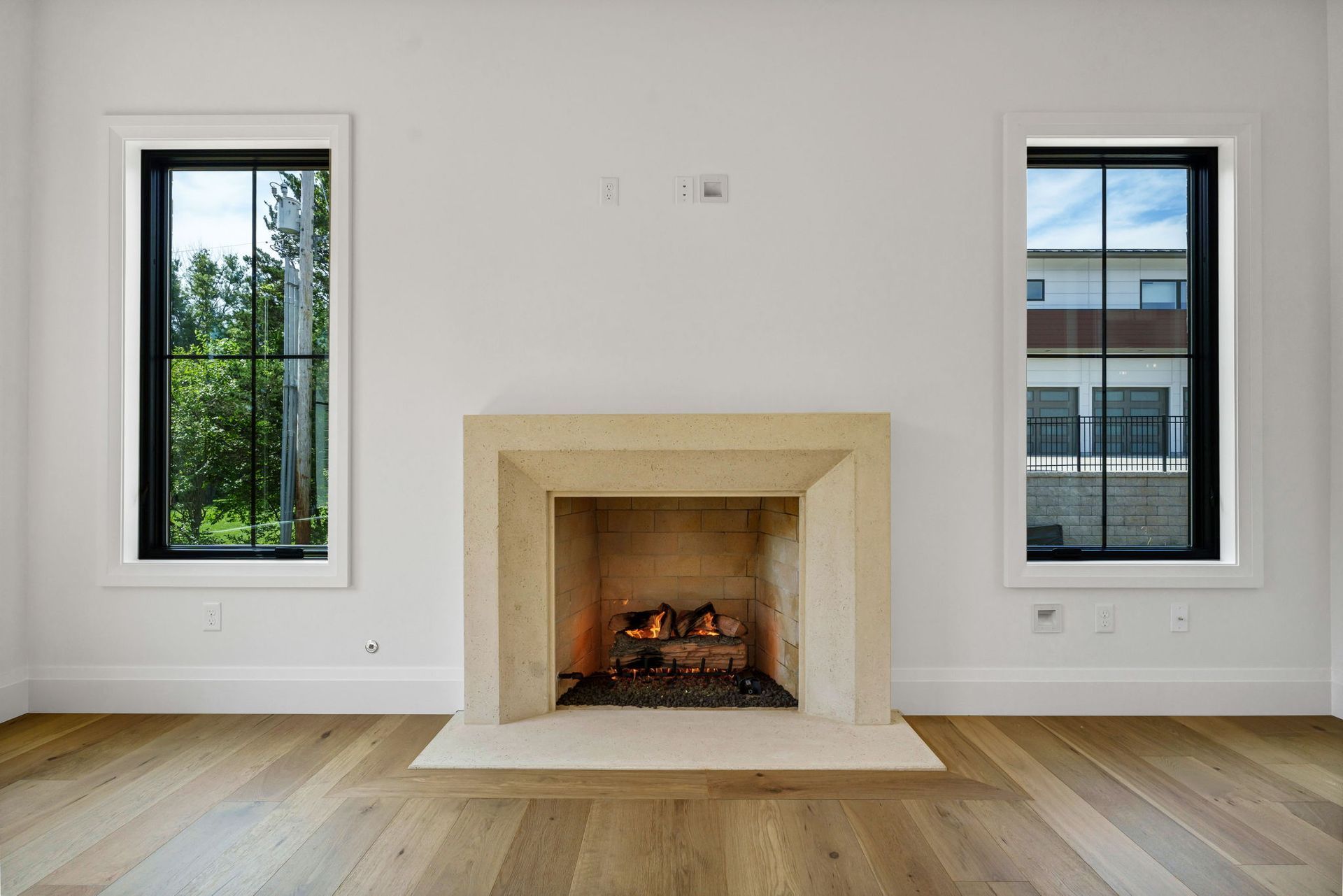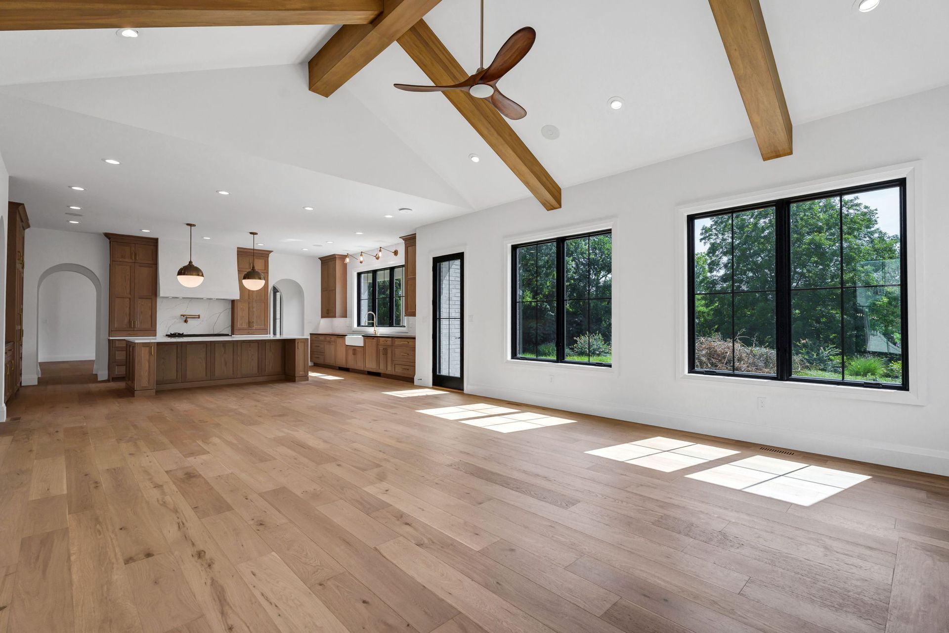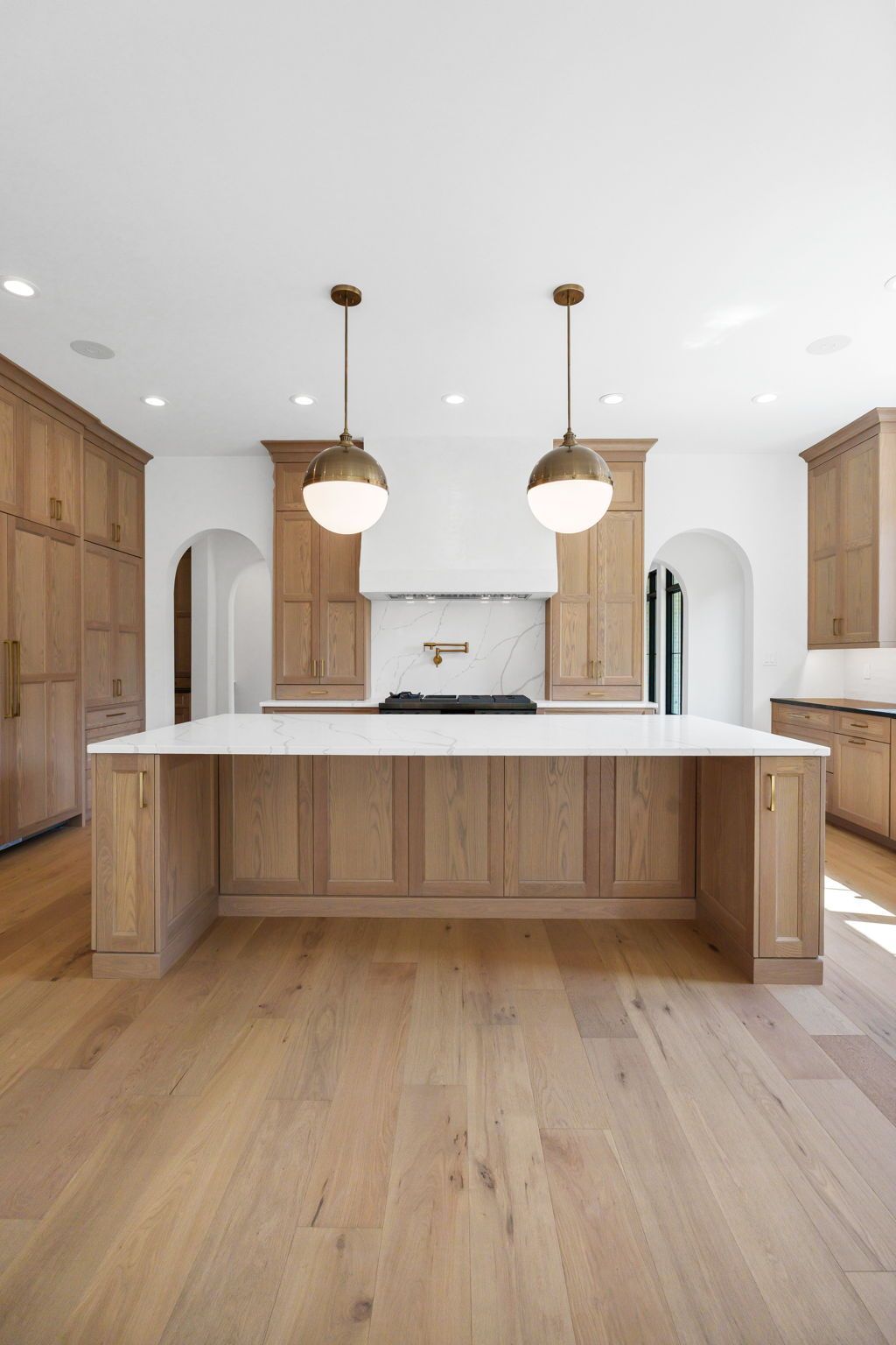 The main level pairs elegance with comfort, featuring 10-foot ceilings, wide-plank hardwood floors, and detailed millwork throughout. At its center, a chef-inspired kitchen with top-tier appliances opens to a warm hearth room, while a covered patio with fireplace extends living outdoors to the expansive backyard.
