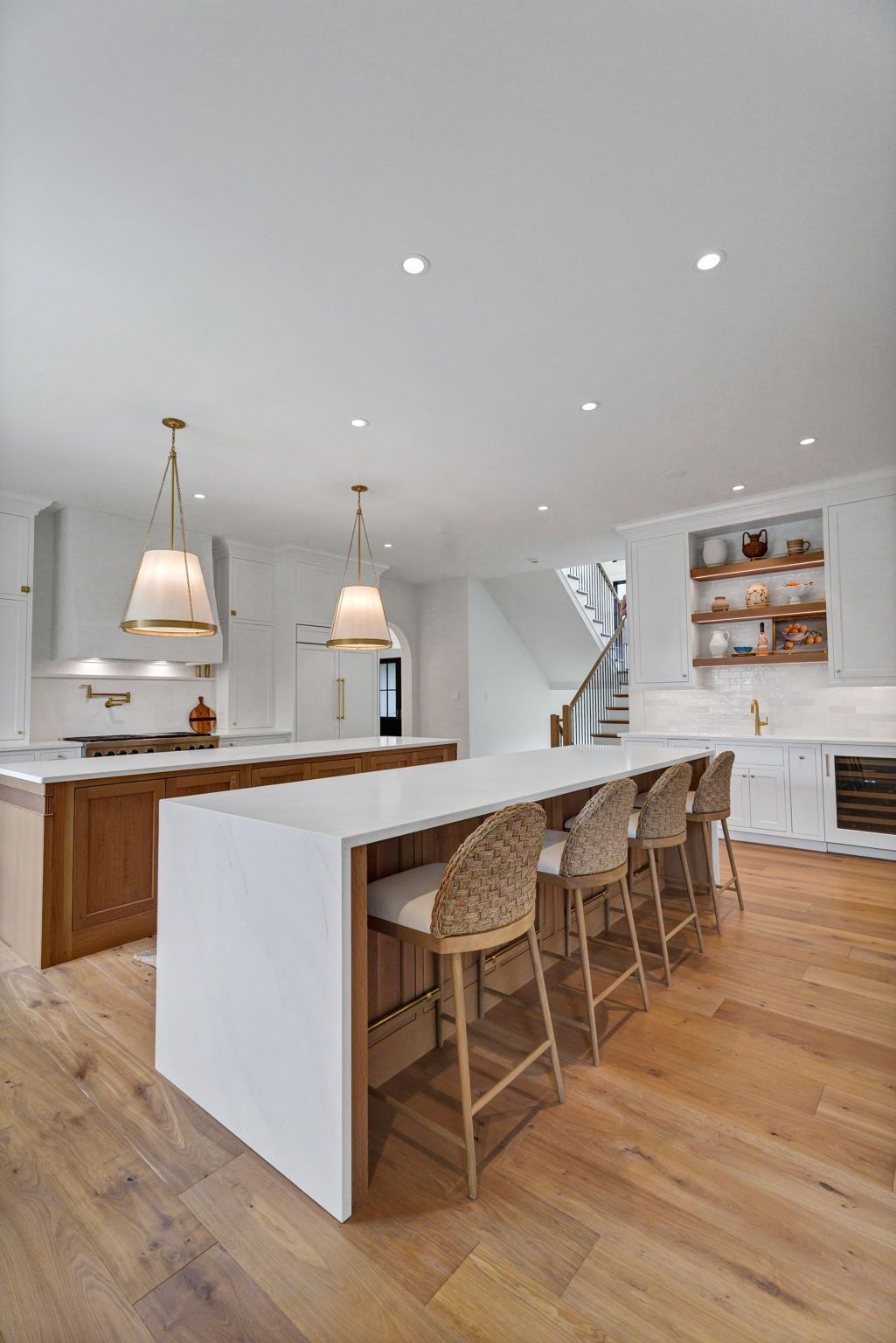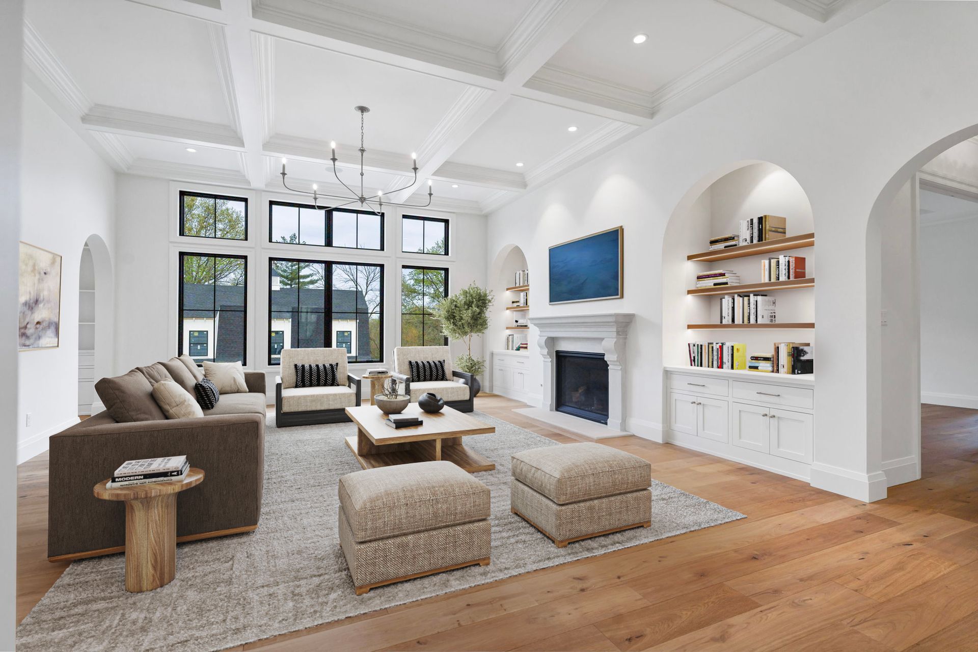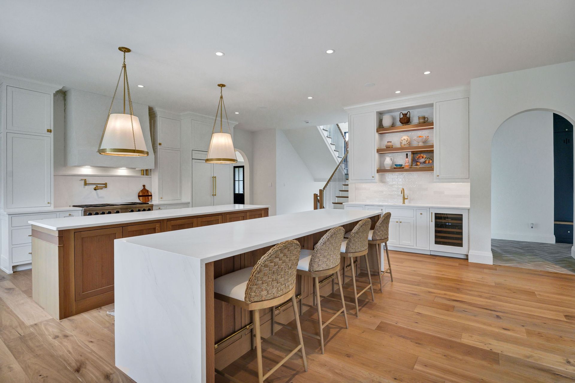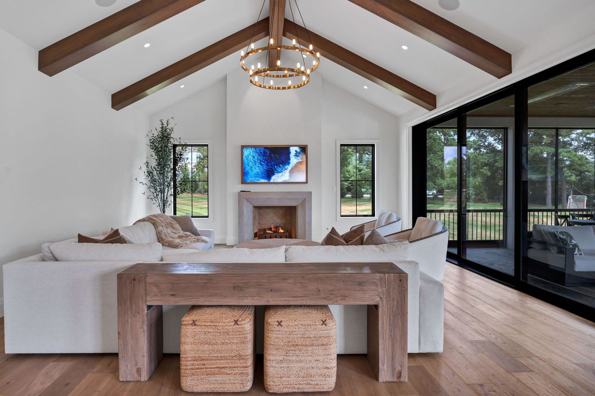 Inside, the home offers exceptional flow, anchored by a designer kitchen with dual islands, Wolf and Sub Zero appliances, and a spacious scullery. The adjoining breakfast room opens into a vaulted hearth room accented with timber beams.