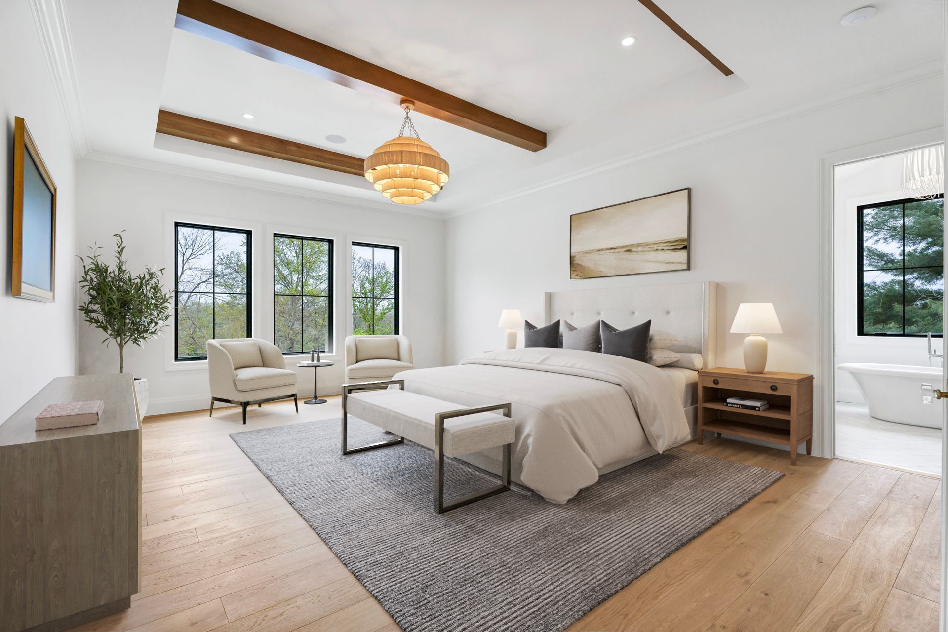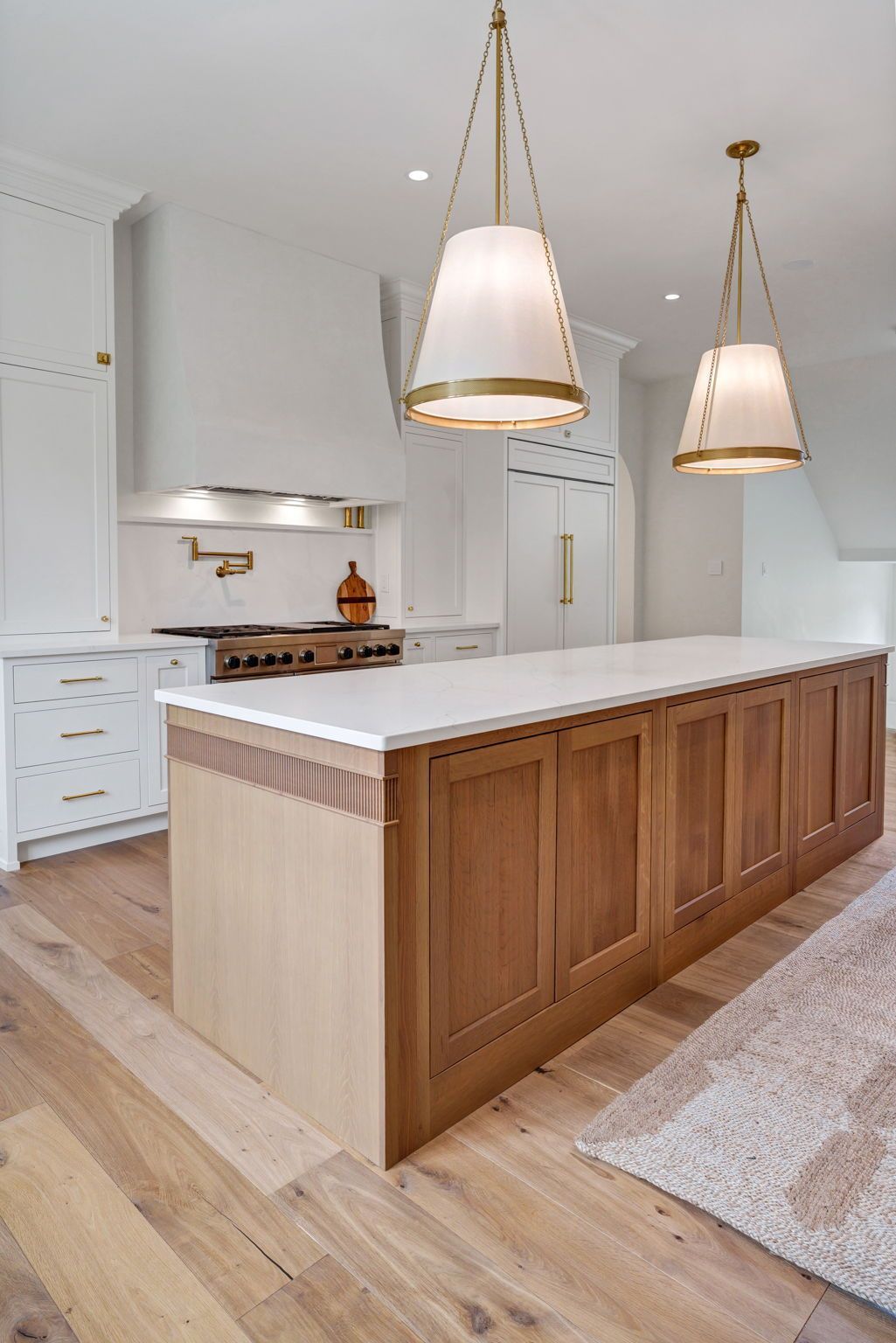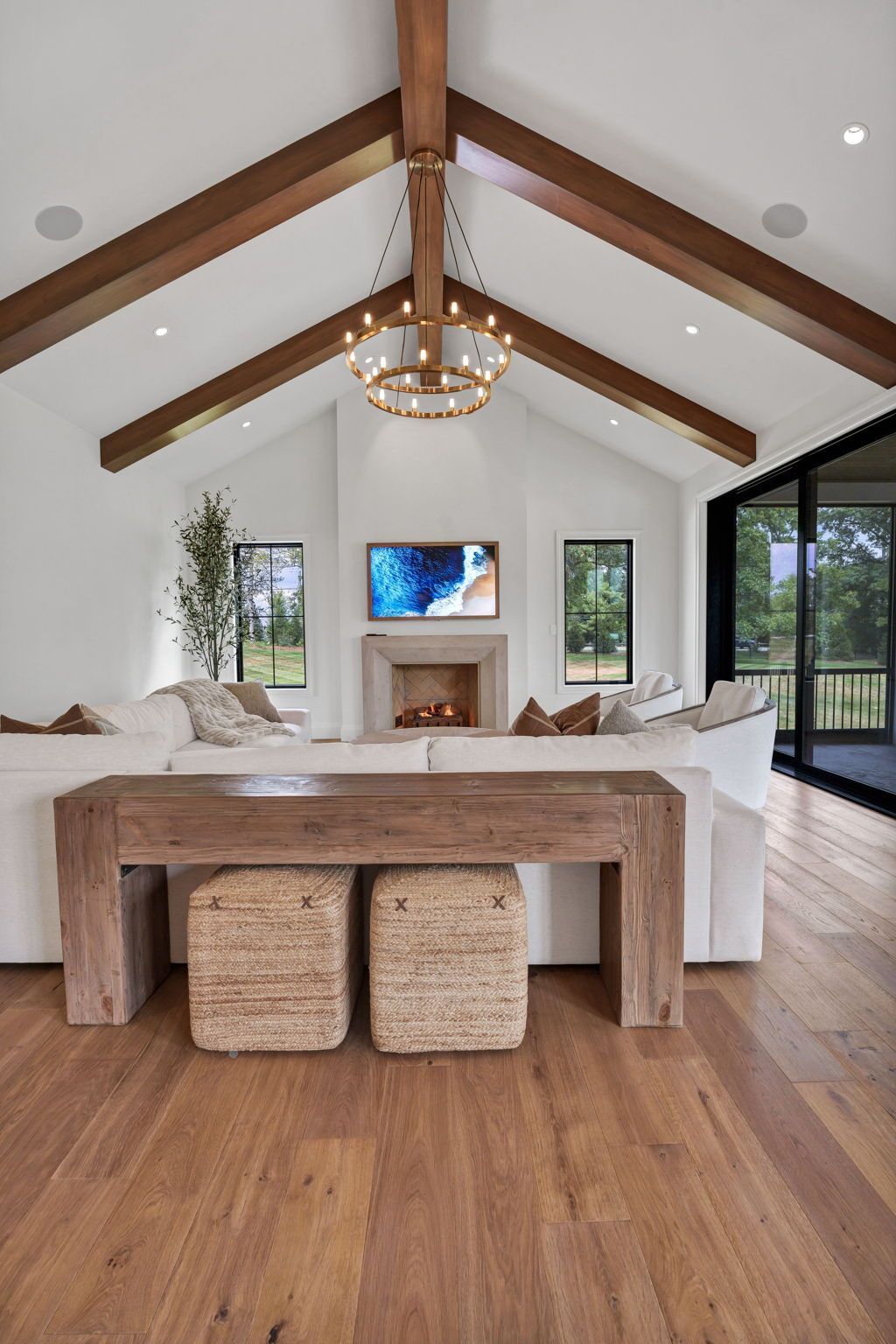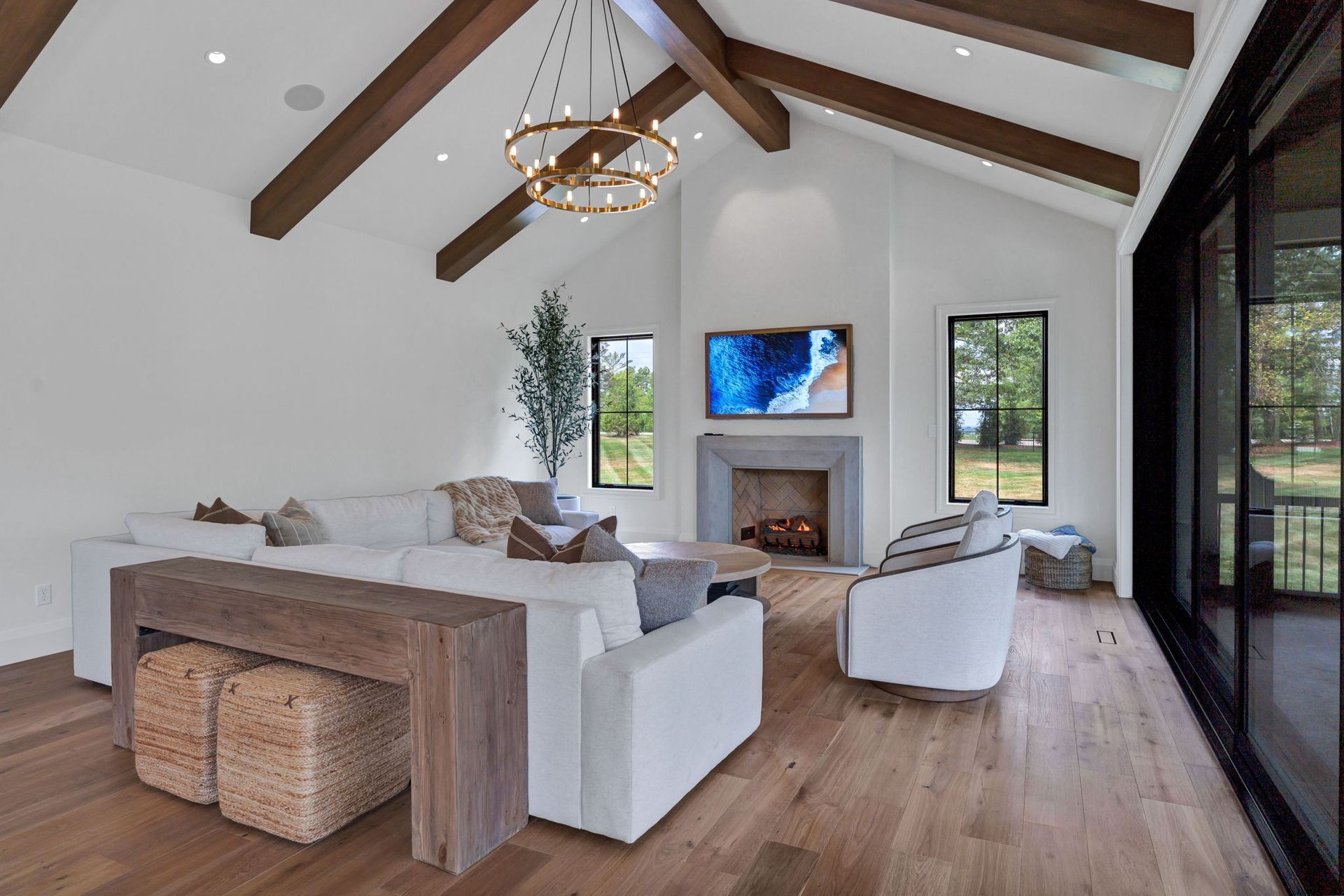 Inside, the home offers exceptional flow, anchored by a designer kitchen with dual islands, Wolf and Sub Zero appliances, and a spacious scullery. The adjoining breakfast room opens into a vaulted hearth room accented with timber beams.