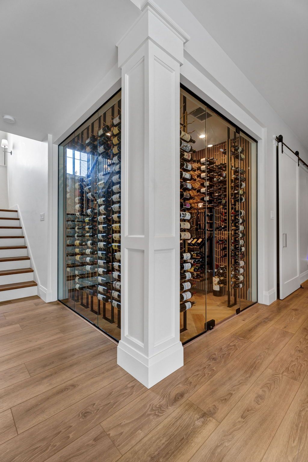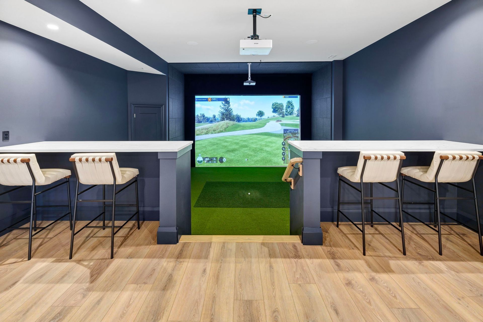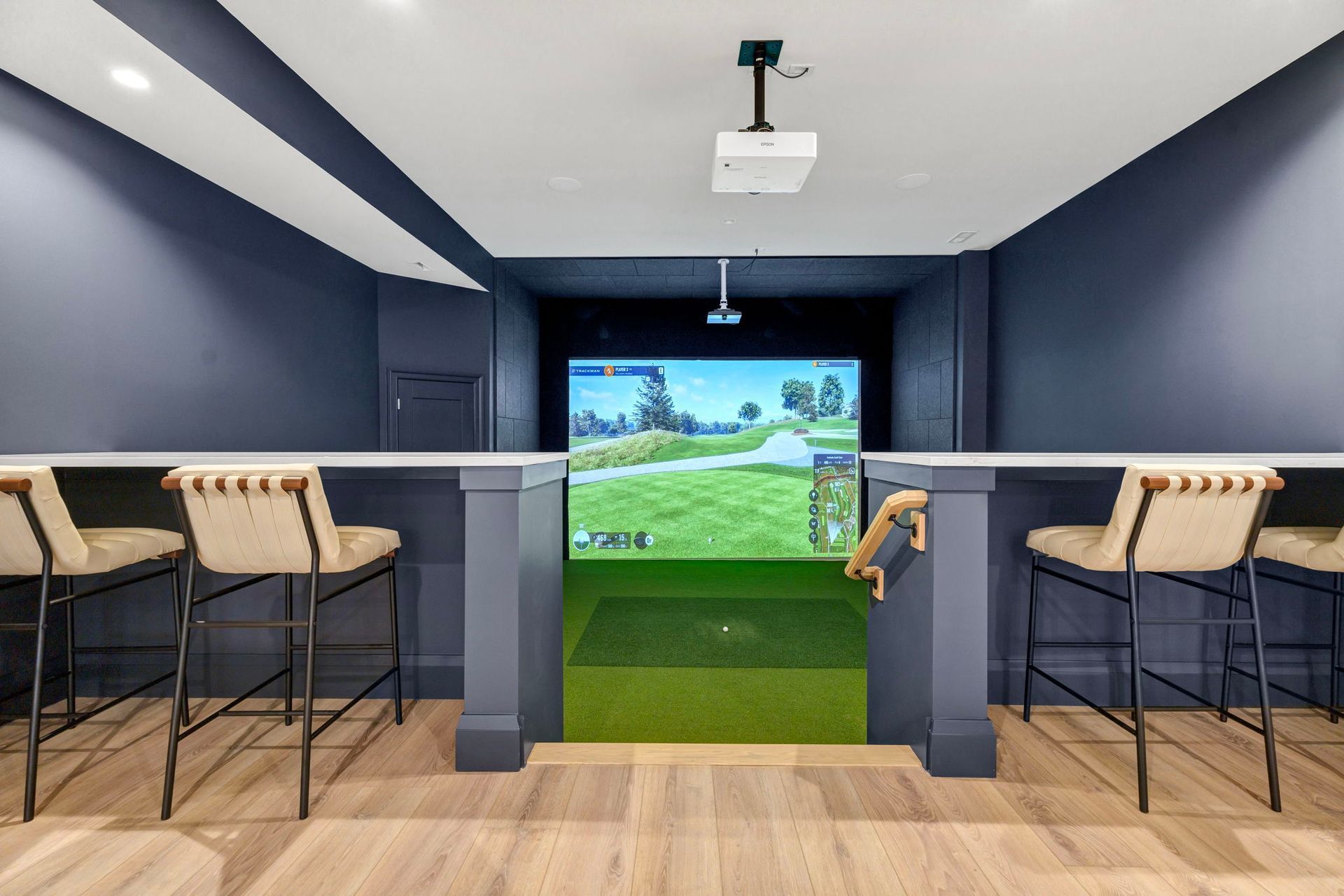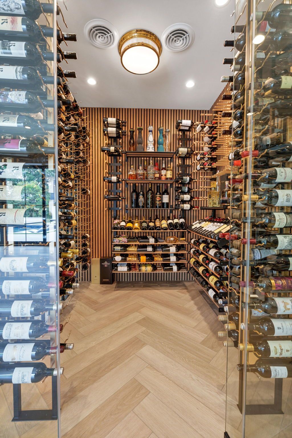 The lower level is an entertainer’s dream, showcasing a grand bar, a sunken golf simulator with Trackman setup, and a showpiece temperature controlled wine cellar with brushed brass racking and white oak paneling.