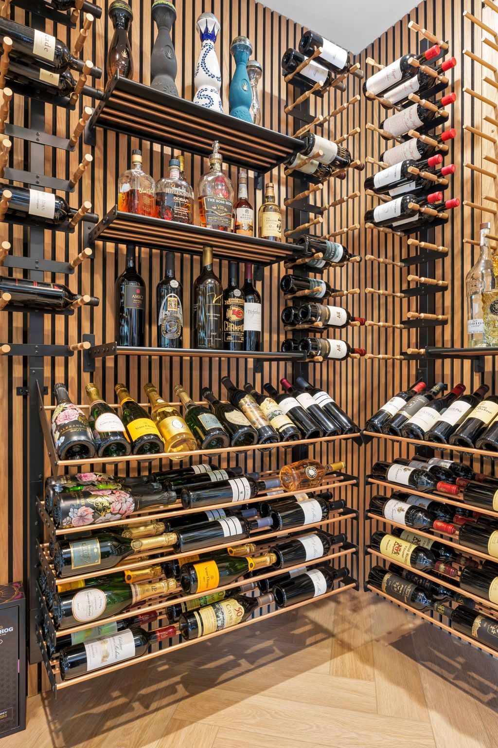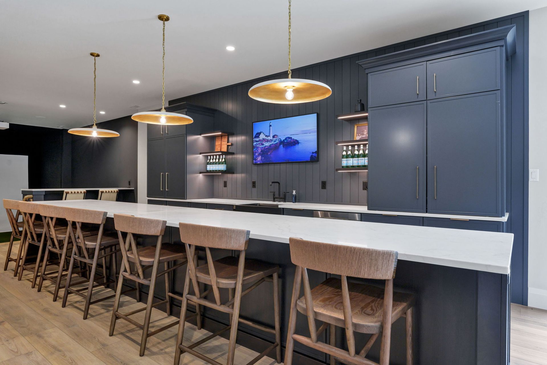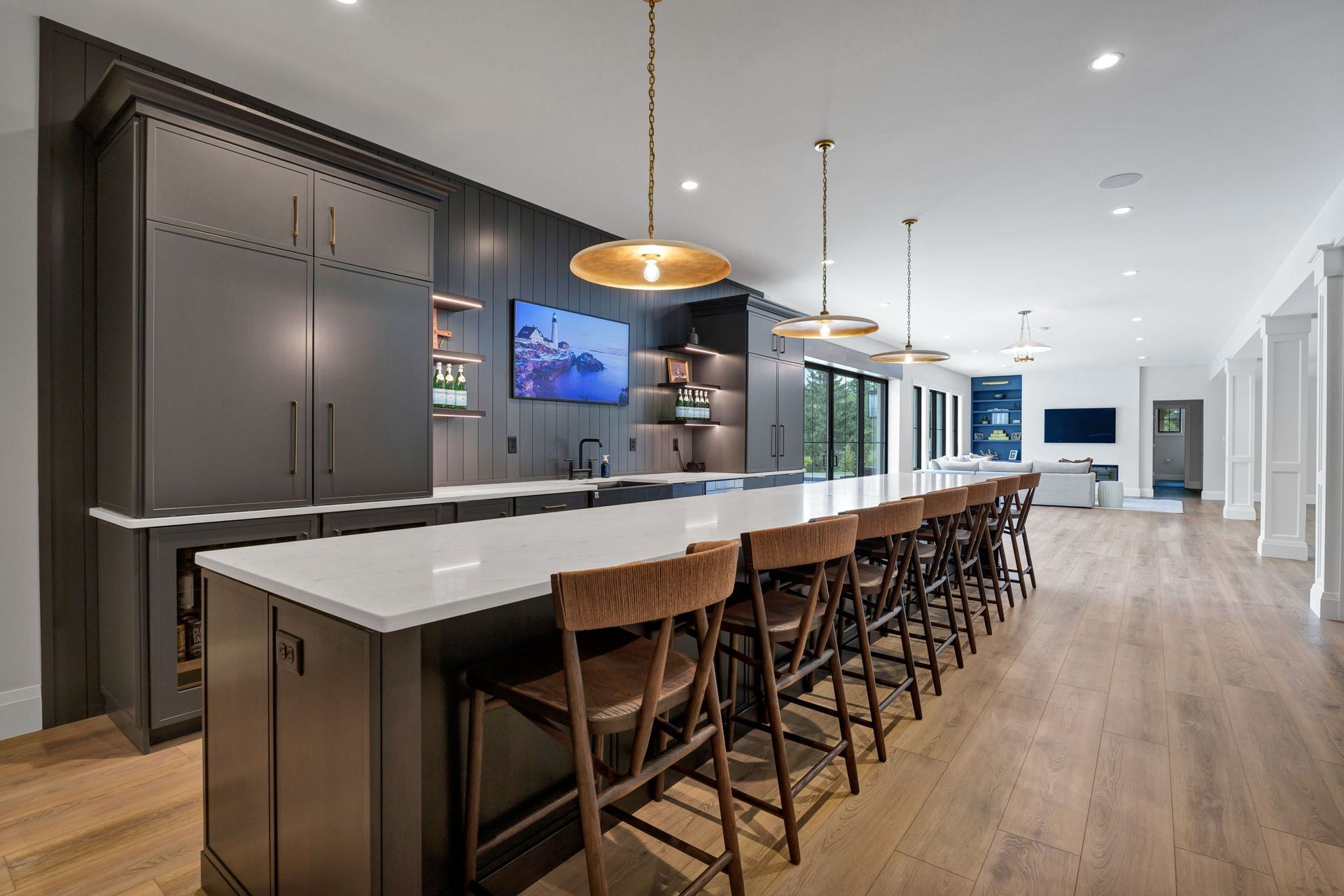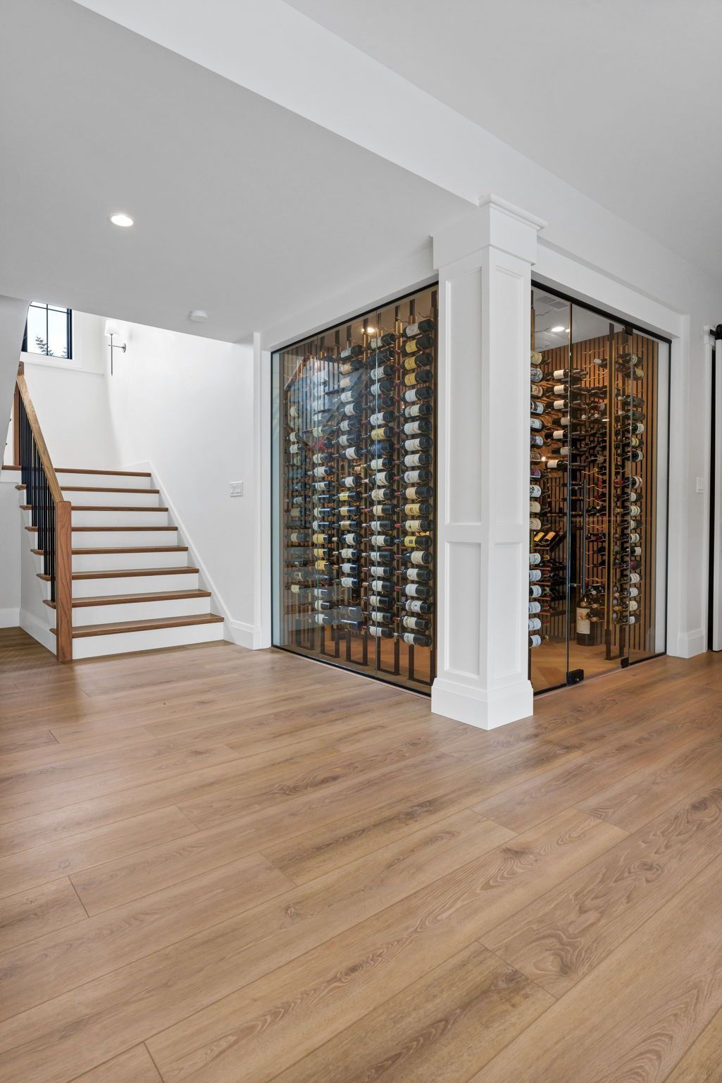 The lower level is an entertainer’s dream, showcasing a grand bar, a sunken golf simulator with Trackman setup, and a showpiece temperature controlled wine cellar with brushed brass racking and white oak paneling.