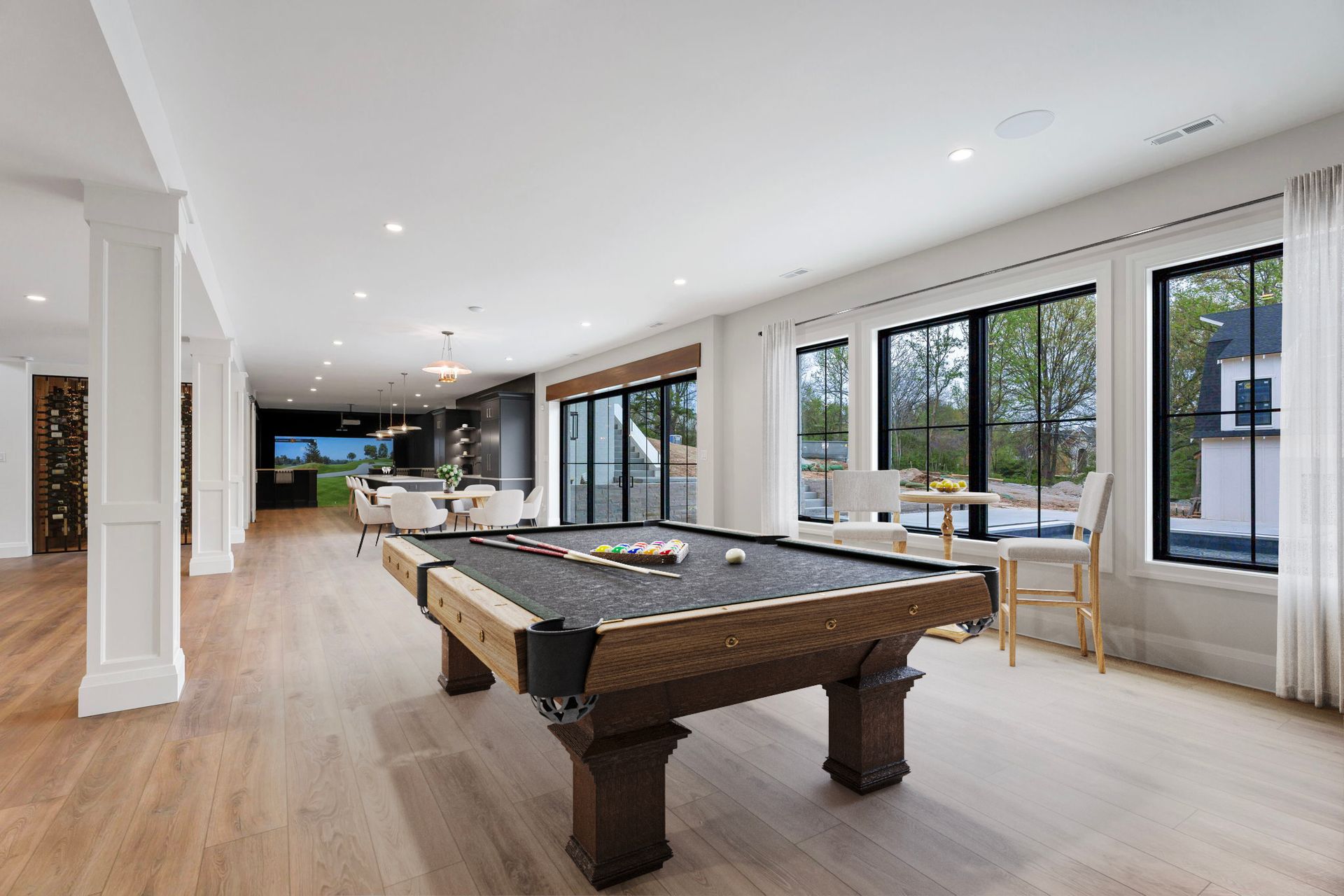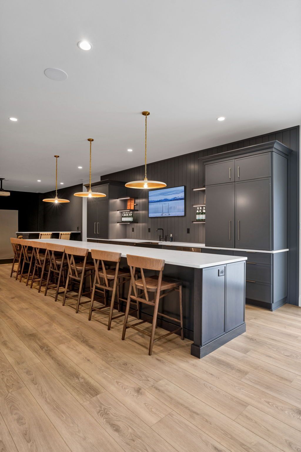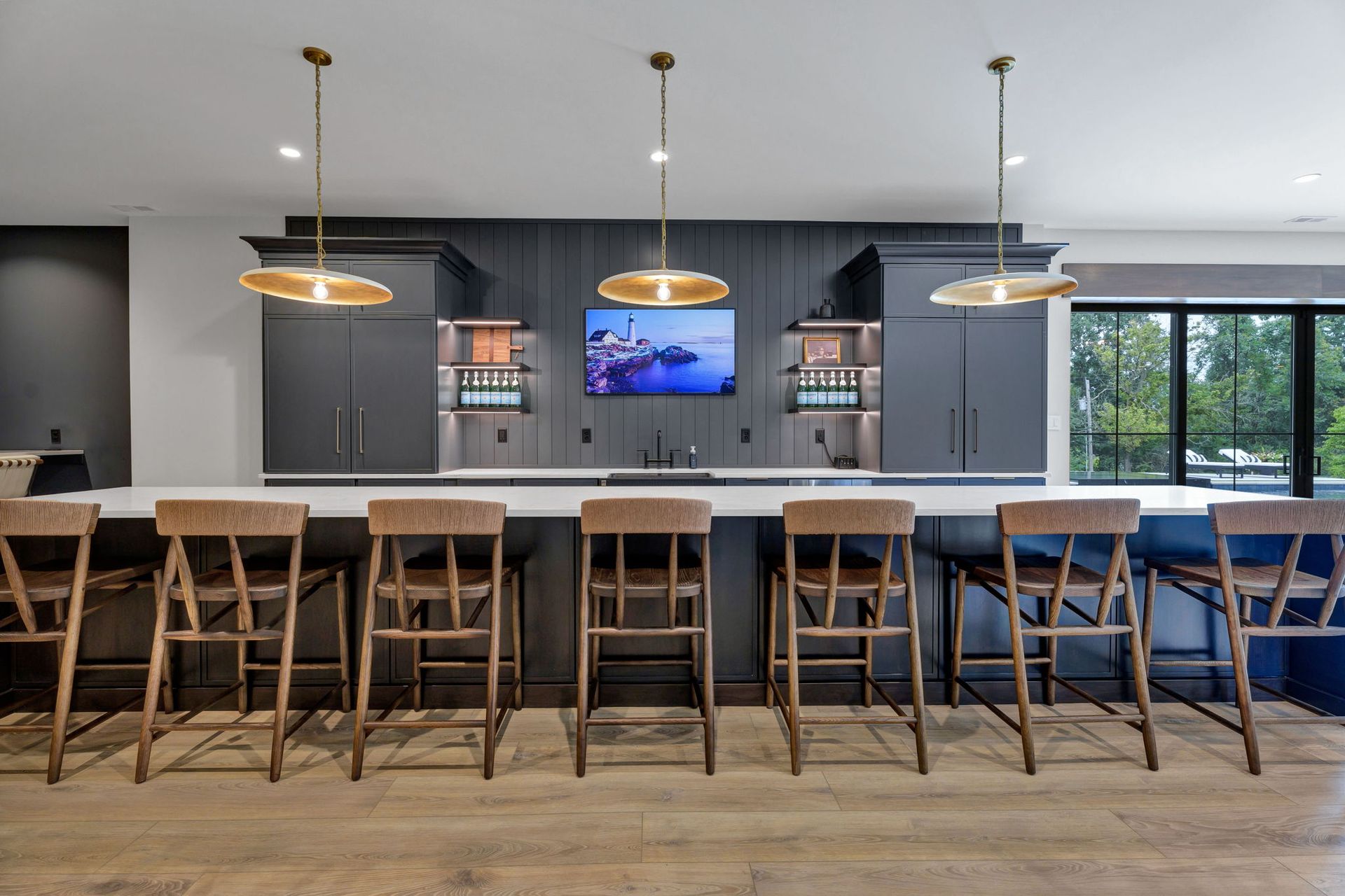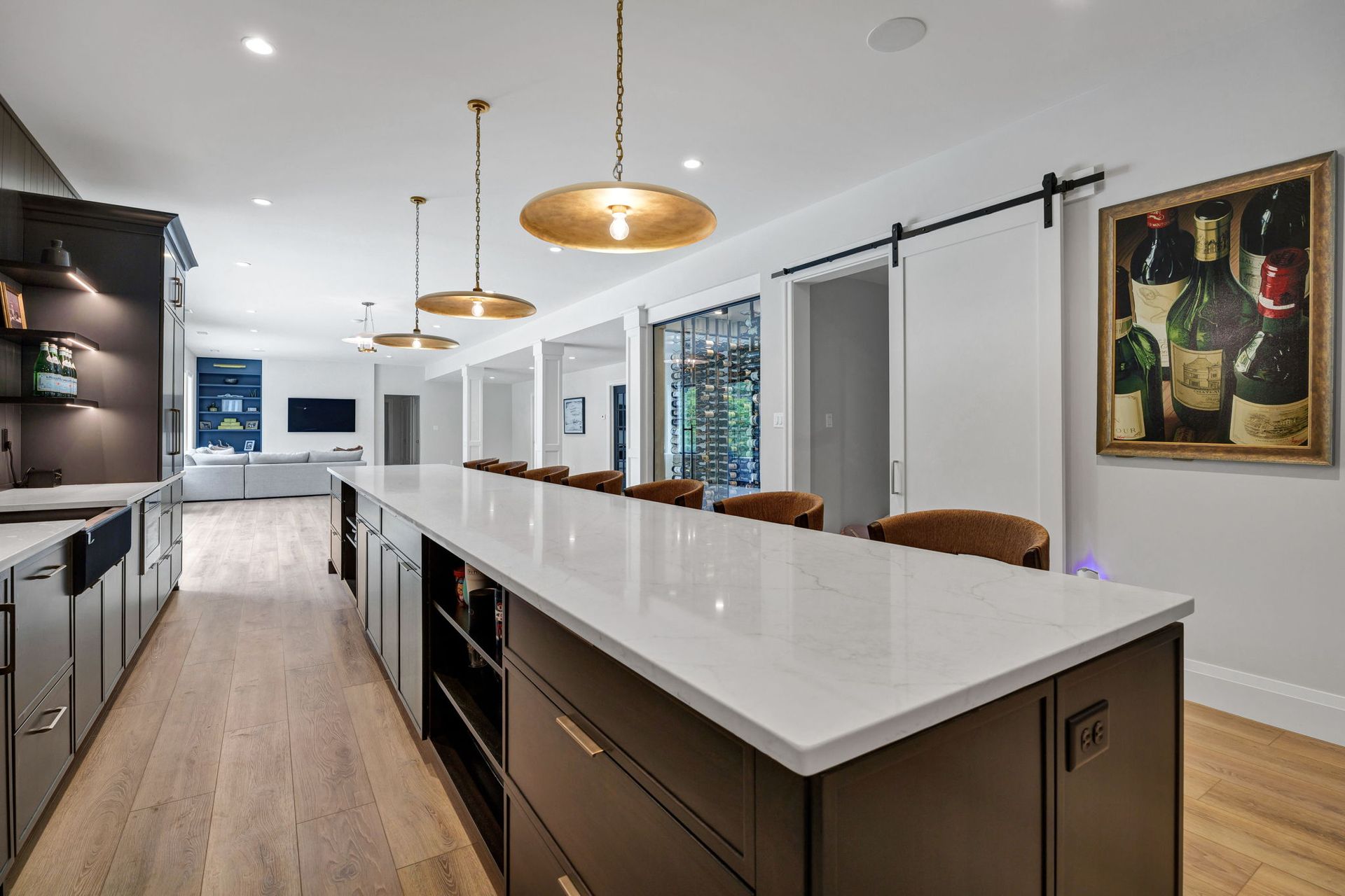 The lower level is an entertainer’s dream, showcasing a grand bar, a sunken golf simulator with Trackman setup, and a showpiece temperature controlled wine cellar with brushed brass racking and white oak paneling.
