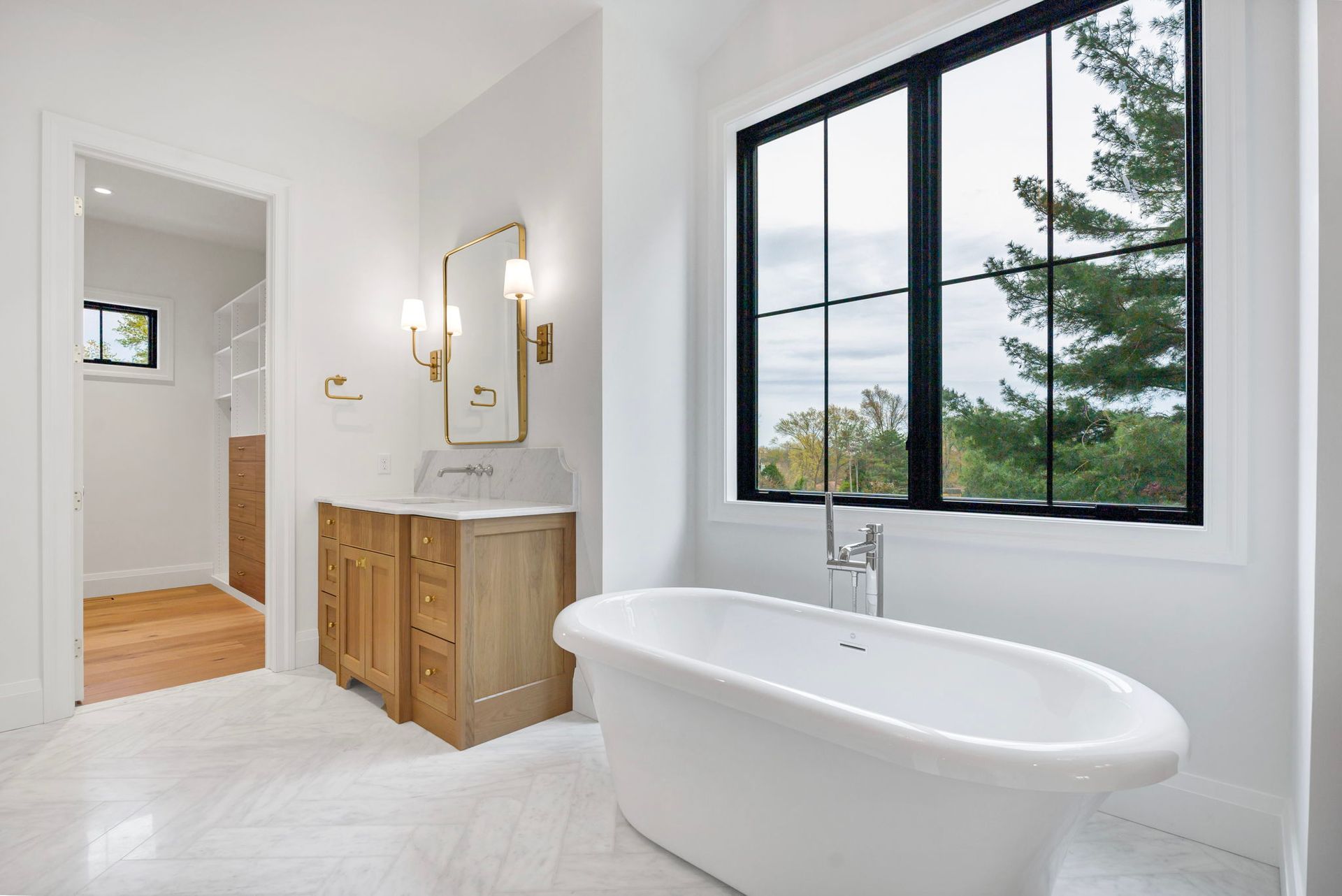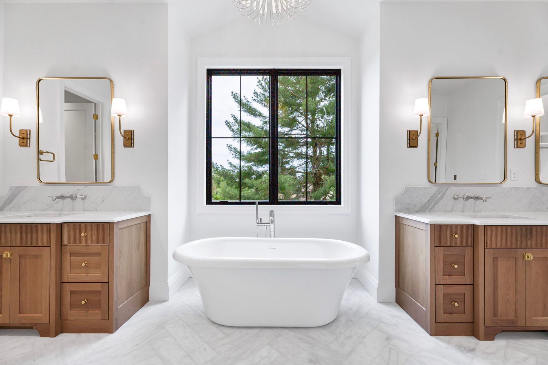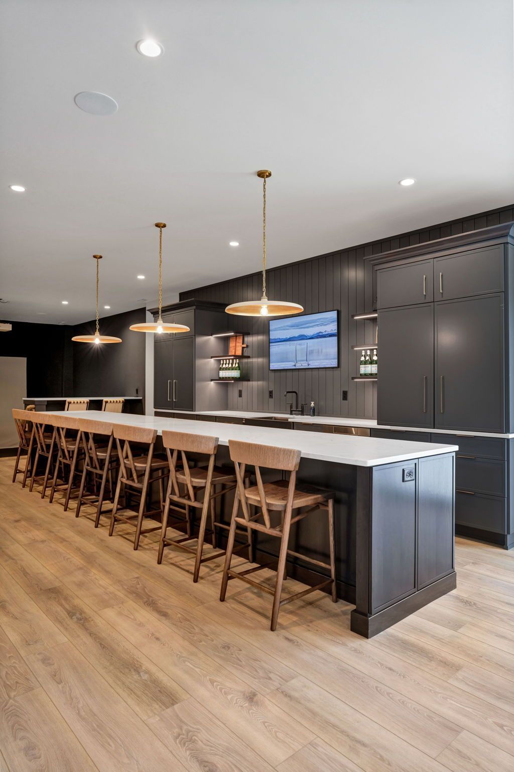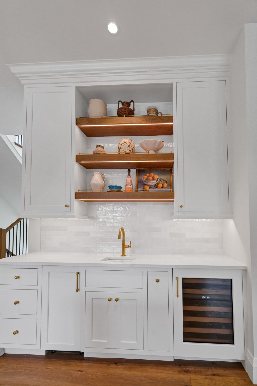 The lower level is an entertainer’s dream, showcasing a grand bar, a sunken golf simulator with Trackman setup, and a showpiece temperature controlled wine cellar with brushed brass racking and white oak paneling.