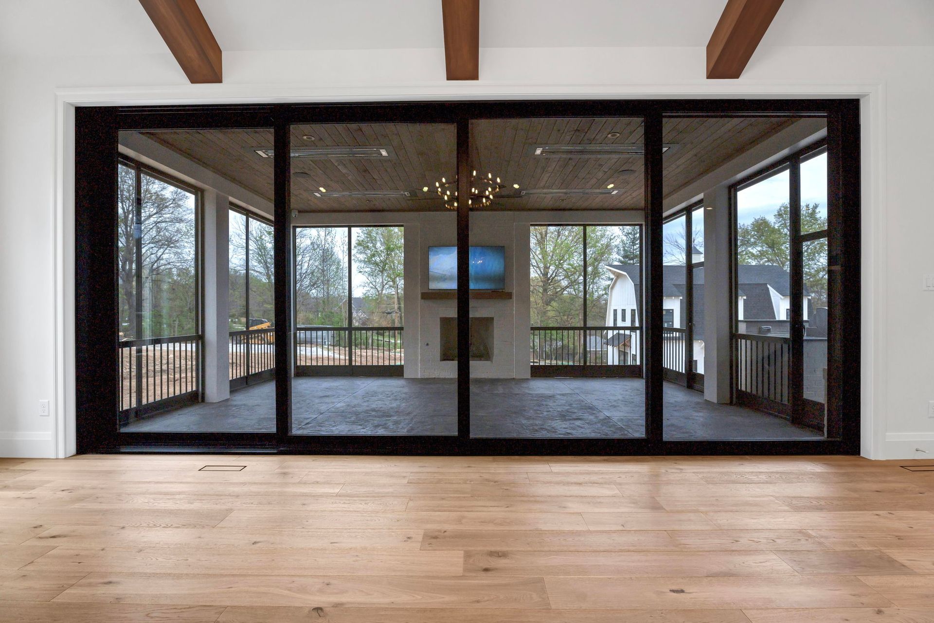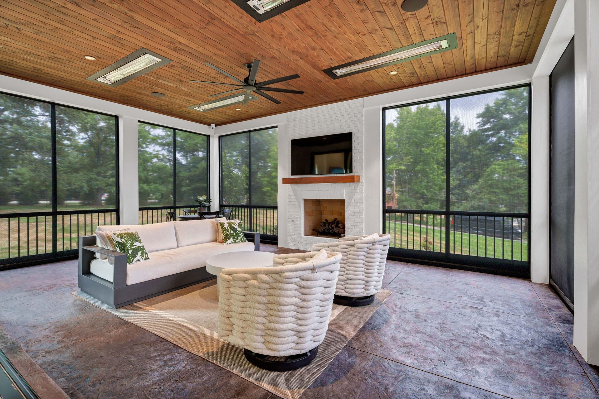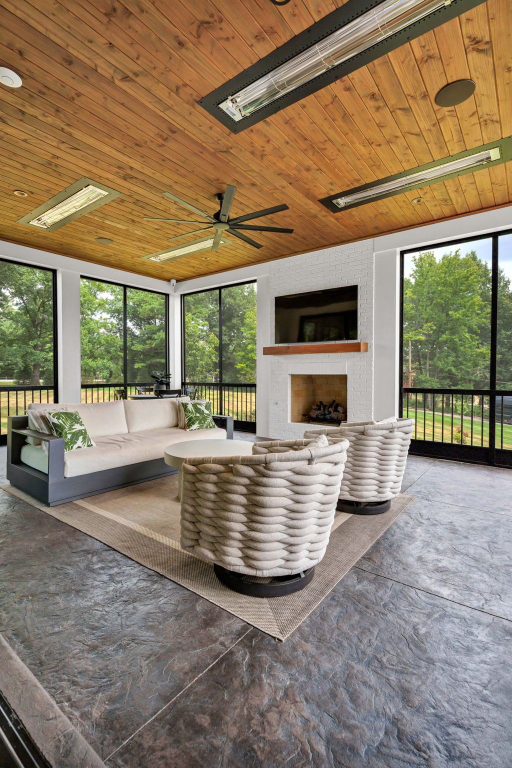 A Pella four panel sliding door connects to the all season outdoor room featuring retractable shades, a full masonry fireplace, and Infratech heaters, making it a true four seasons retreat.